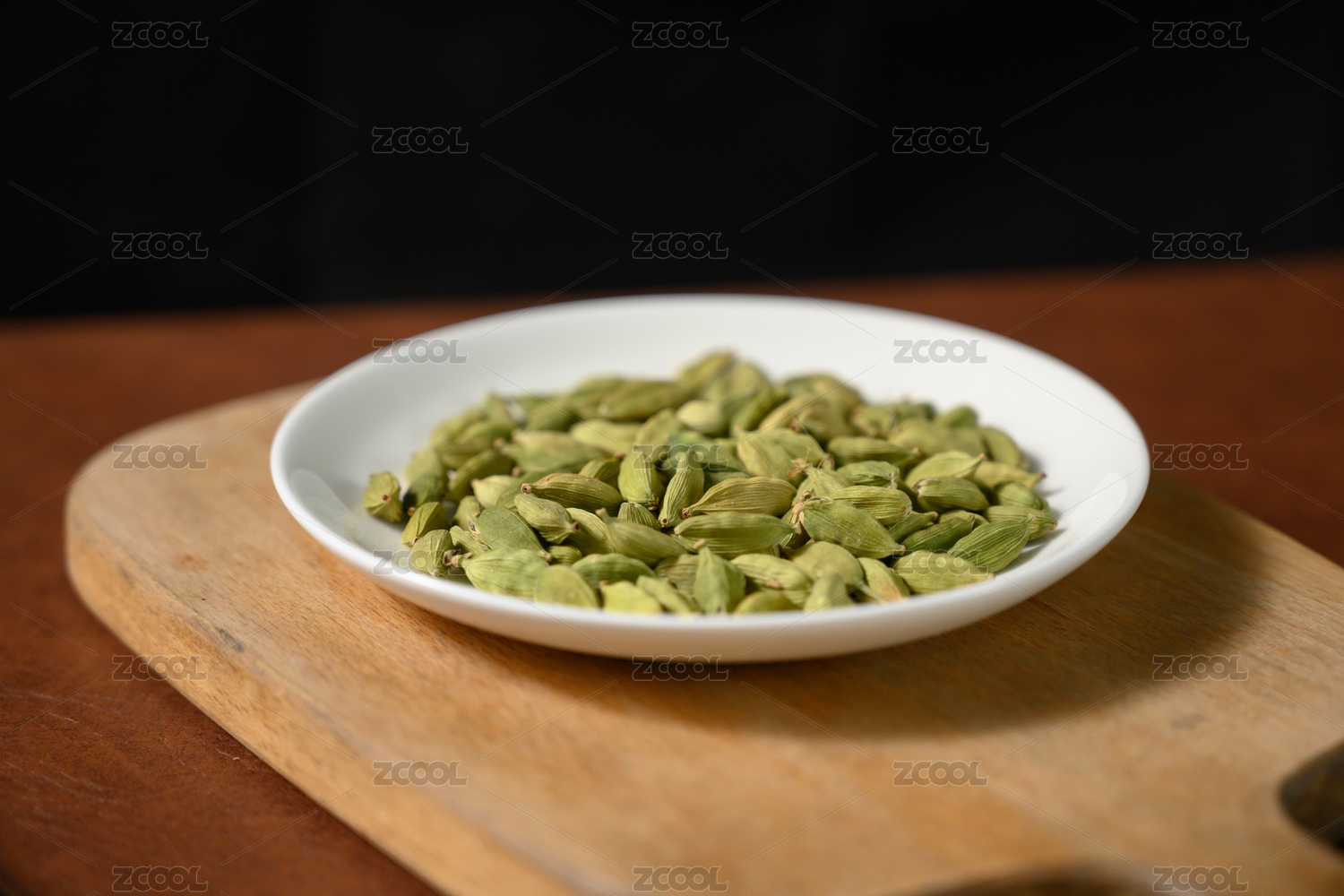 桌面上的盘子里的香气四溢的绿豆蔻