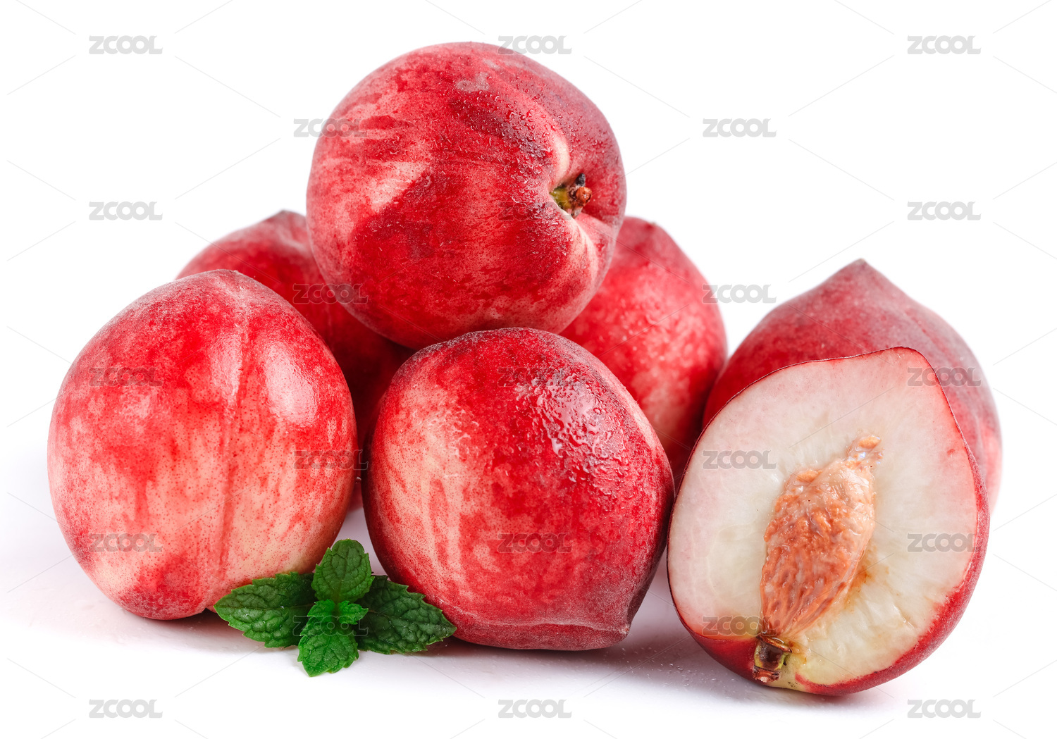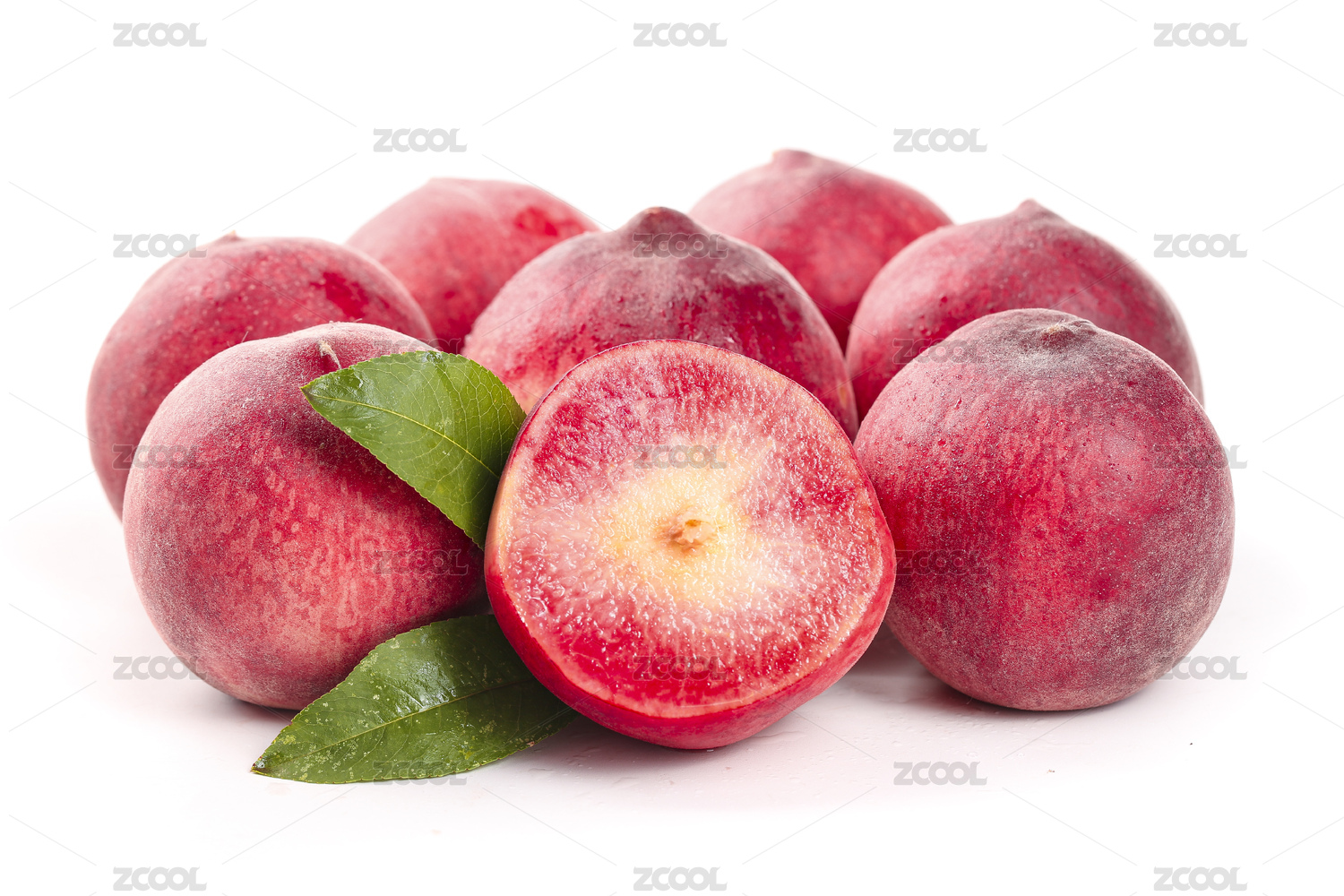 白底上放着一堆胭脂血桃和半边水蜜桃