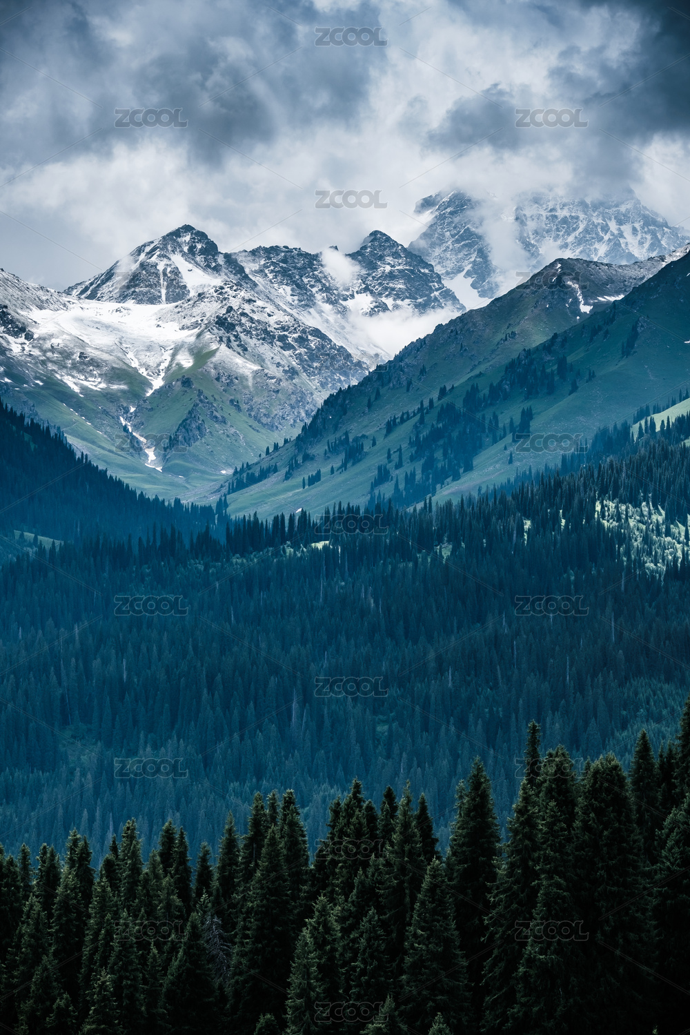 中国新疆伊利库尔德宁高山草原雪岭云杉