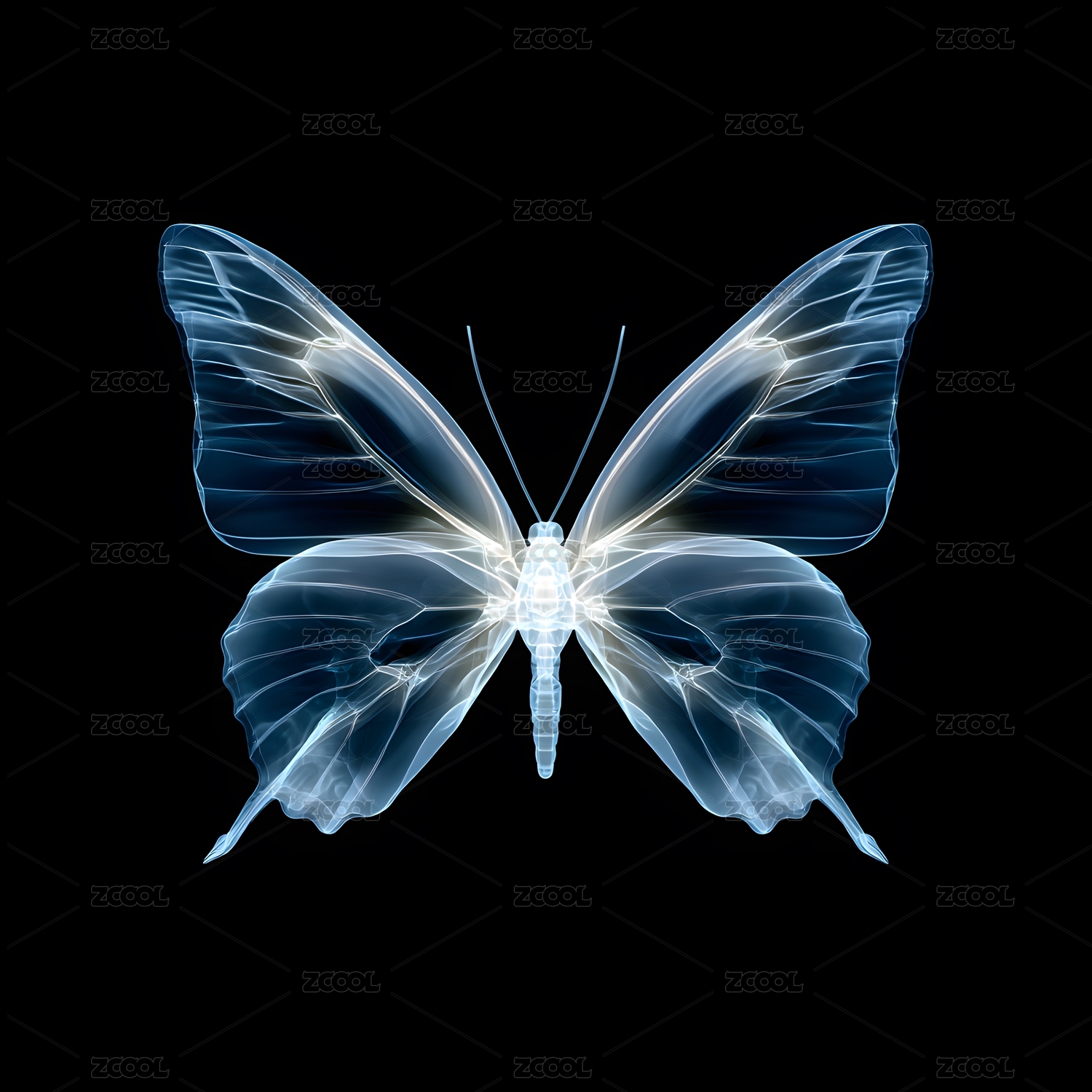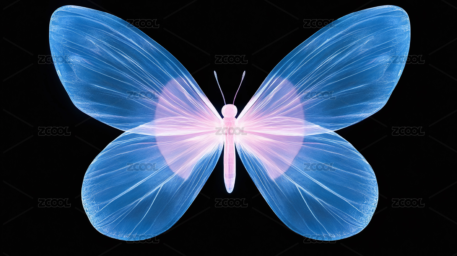 透明蓝光蝴蝶展翅于黑色背景