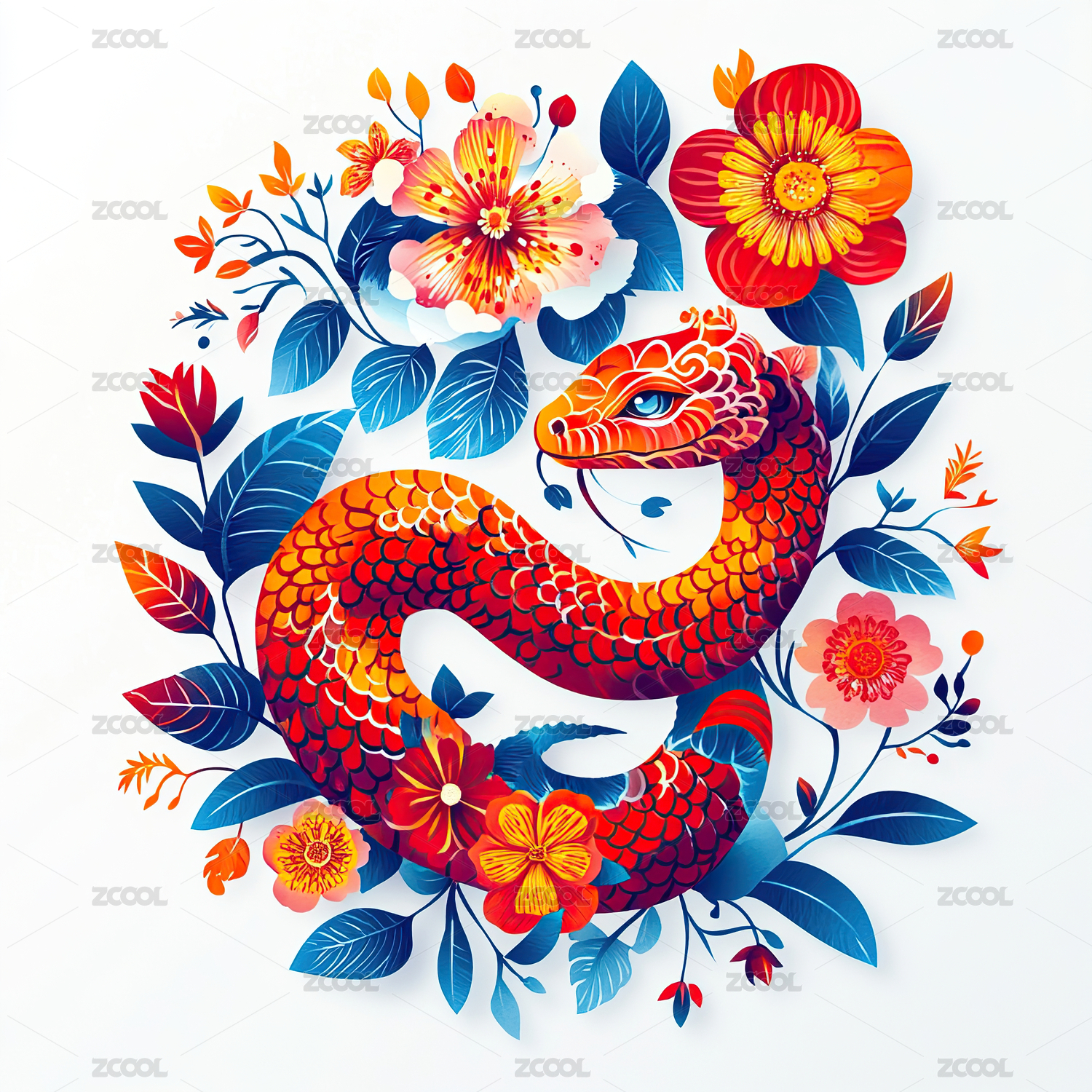 国风复古蛇年喜庆植物花卉手绘插画