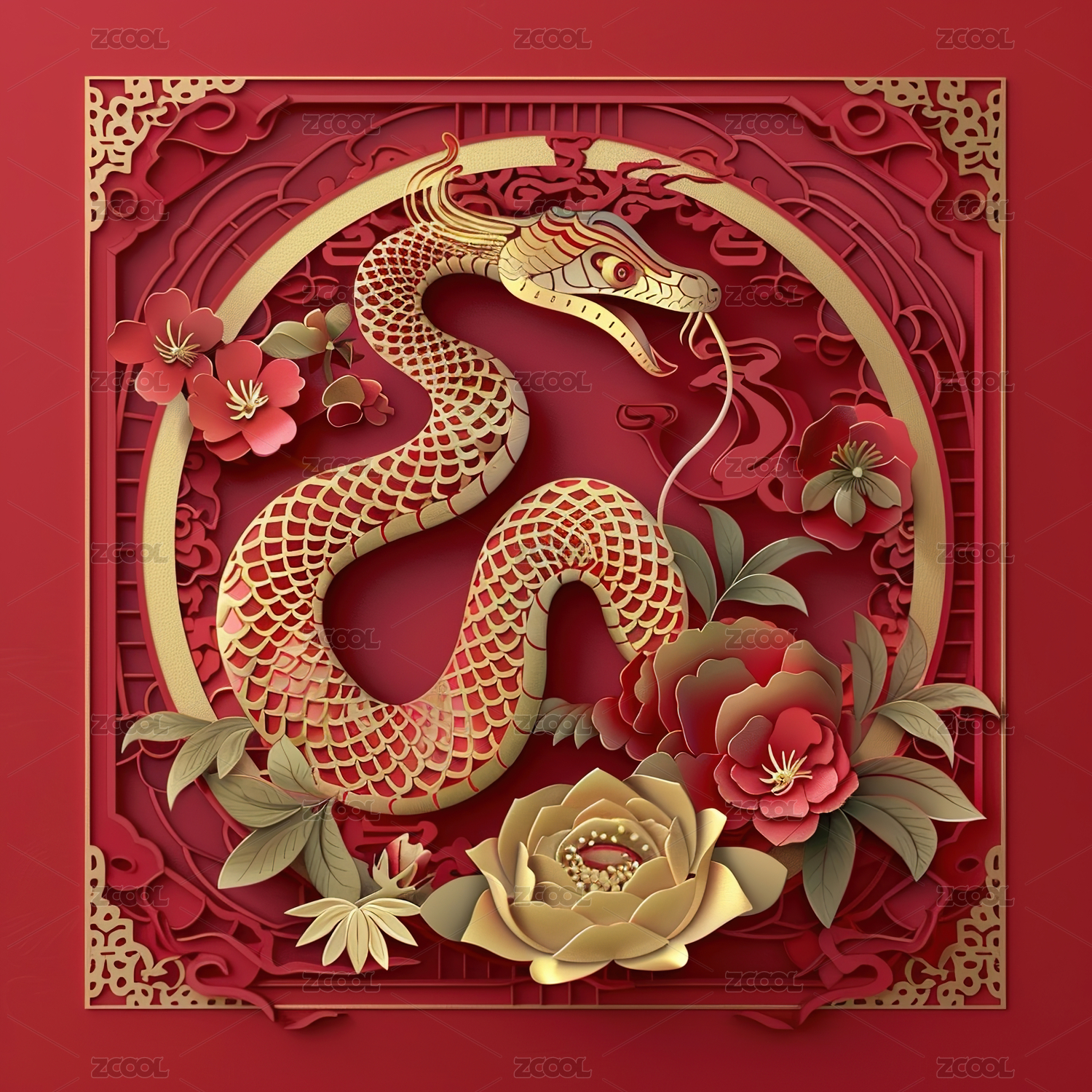 蛇年立体剪纸风格春节主题