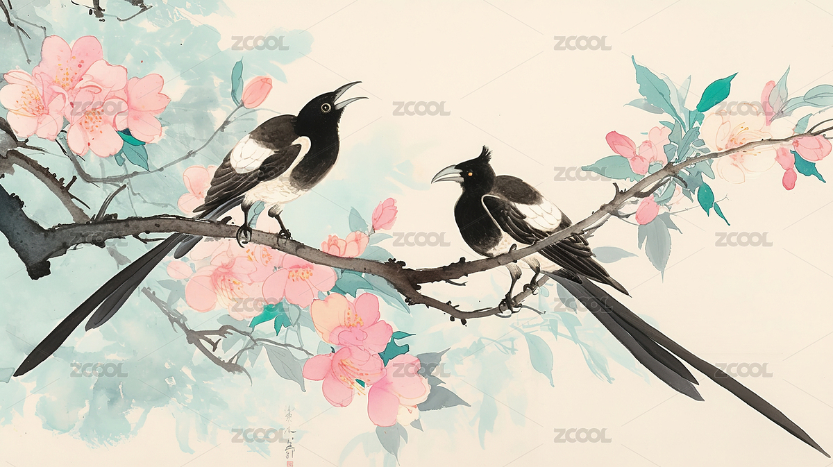 AIGC中国风喜鹊花鸟水墨画插画