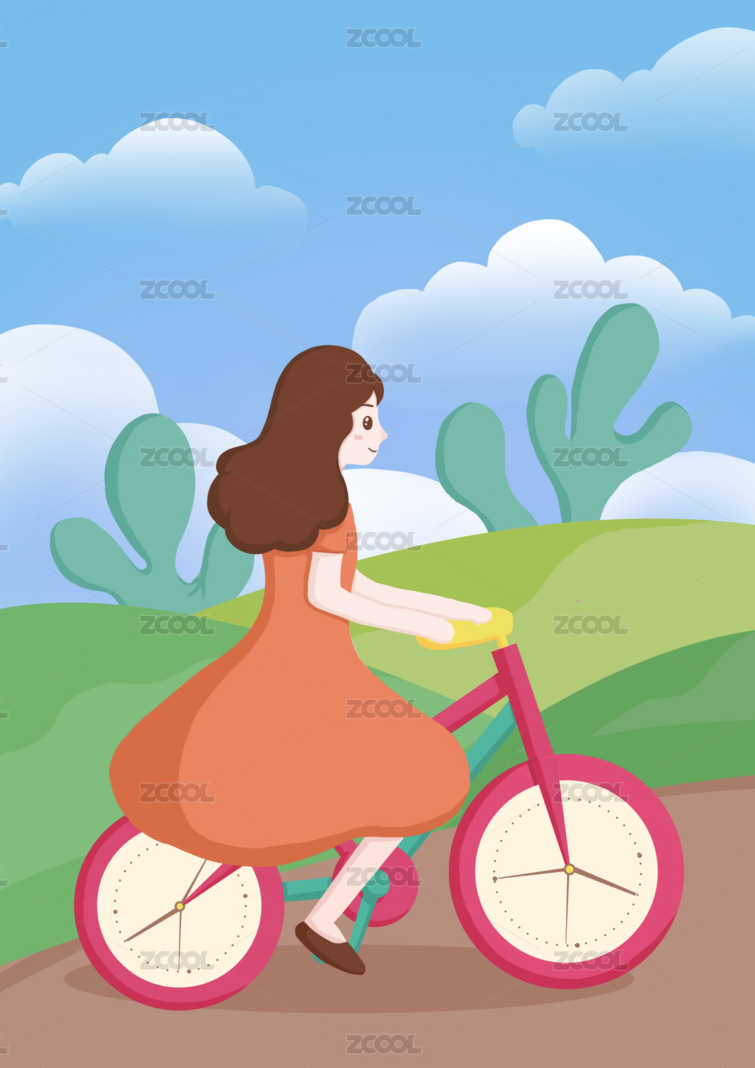 骑自行车外出旅游的女孩手绘适量插画