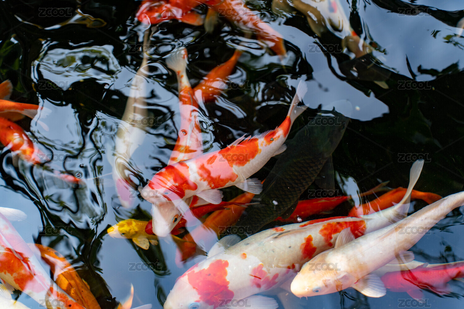 观赏鱼池里五颜六色的成群的锦鲤和金鱼
