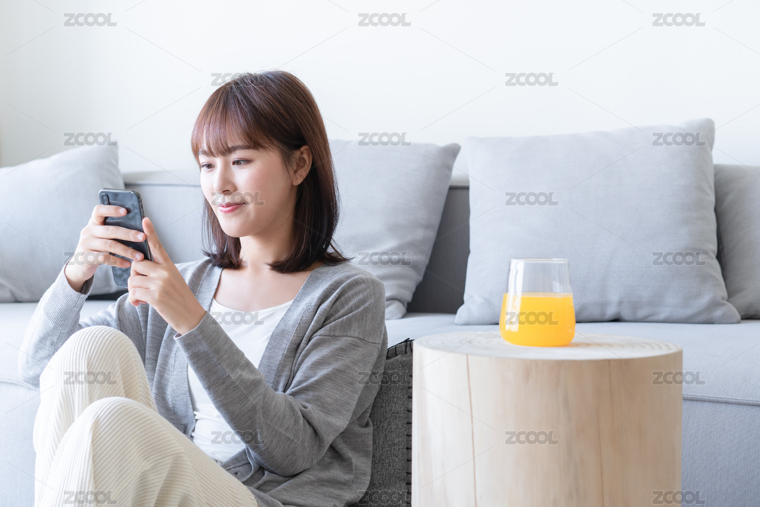 年轻女性坐在沙发上玩手机