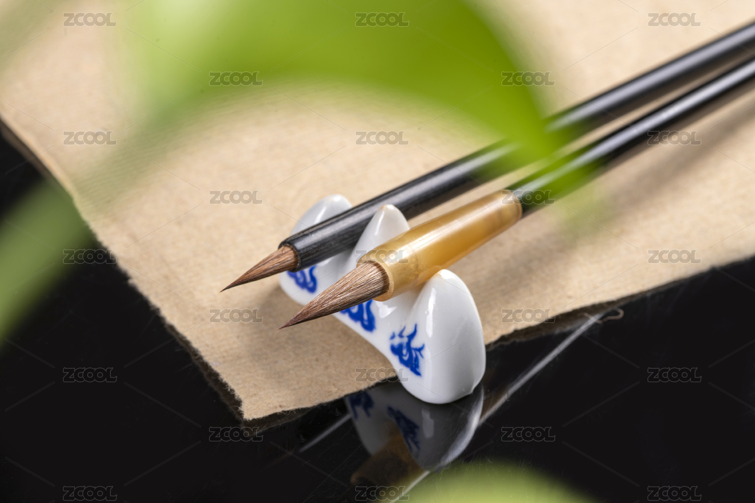 两支毛笔架在笔架上特写旁边放有宣纸