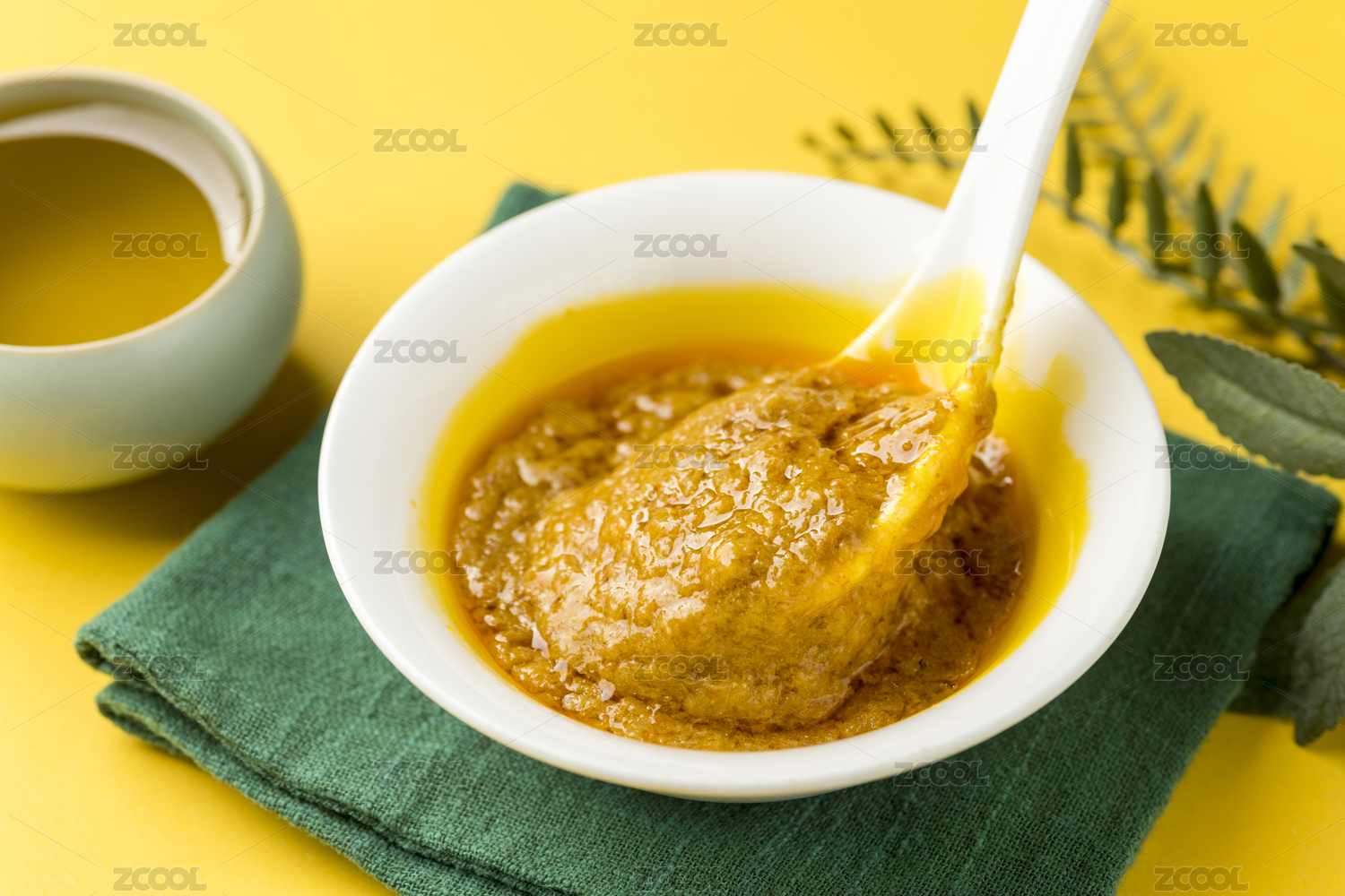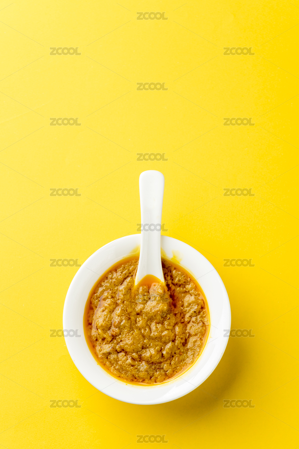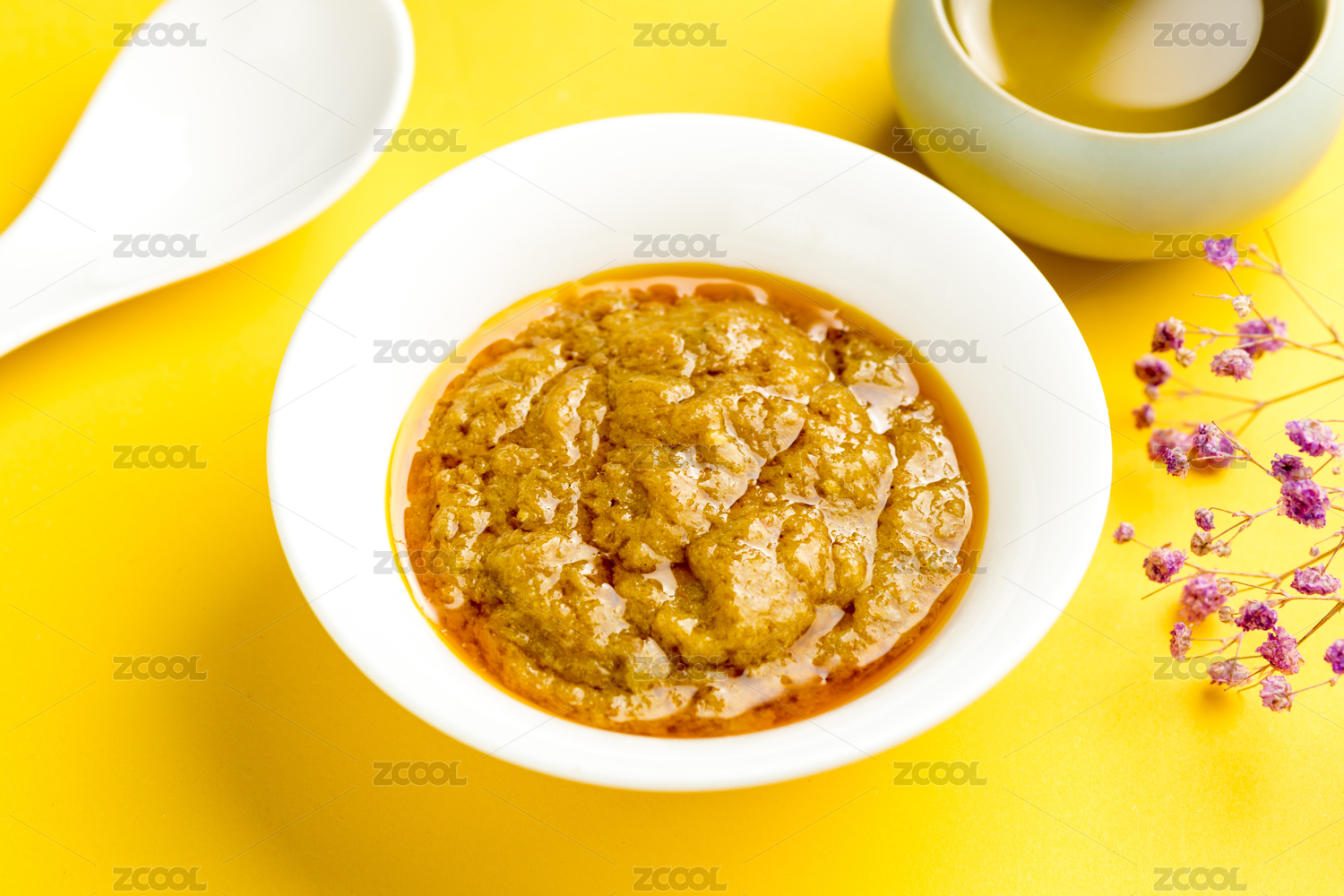 蟹黄鲜酱摆放在桌面上勺盛蟹黄酱特写