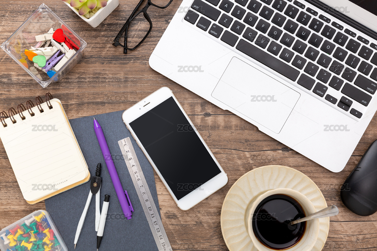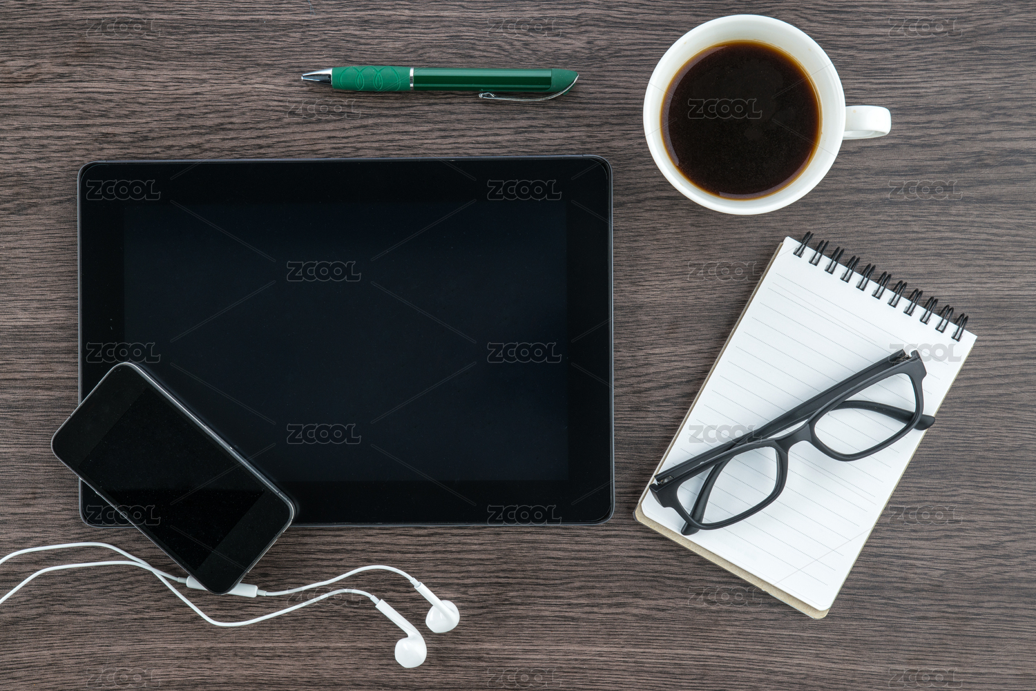 桌面上的记事本和手机咖啡等物品