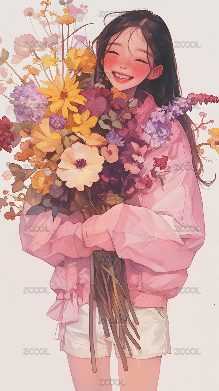 穿着旗袍的女孩在窗边拿着一束花对花微笑