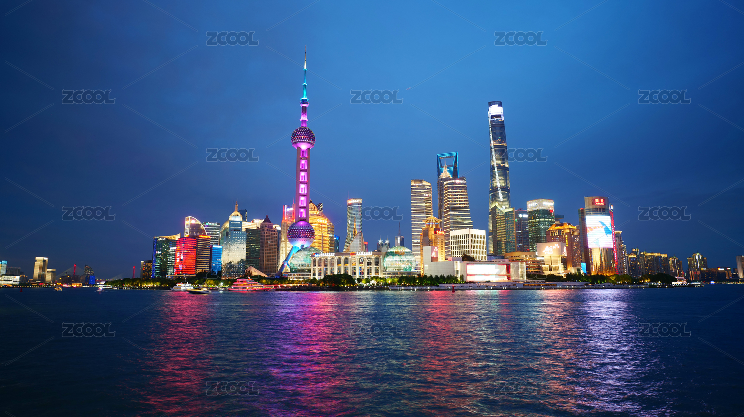 夏季上海夜晚市中心建筑和黄浦江水面景观