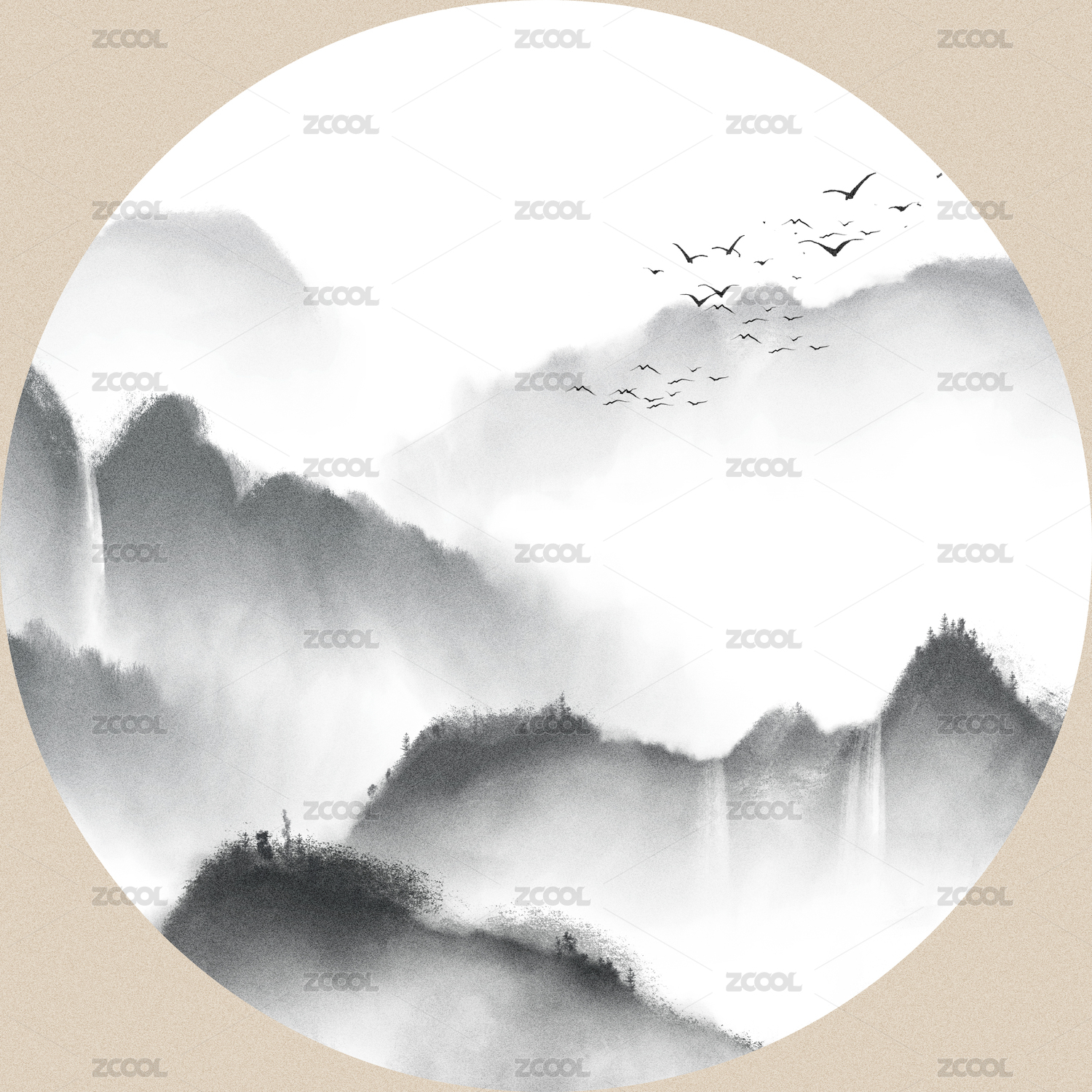 插画,背景,圆形,水墨,手绘,国画,田园,淡雅,清新,复古