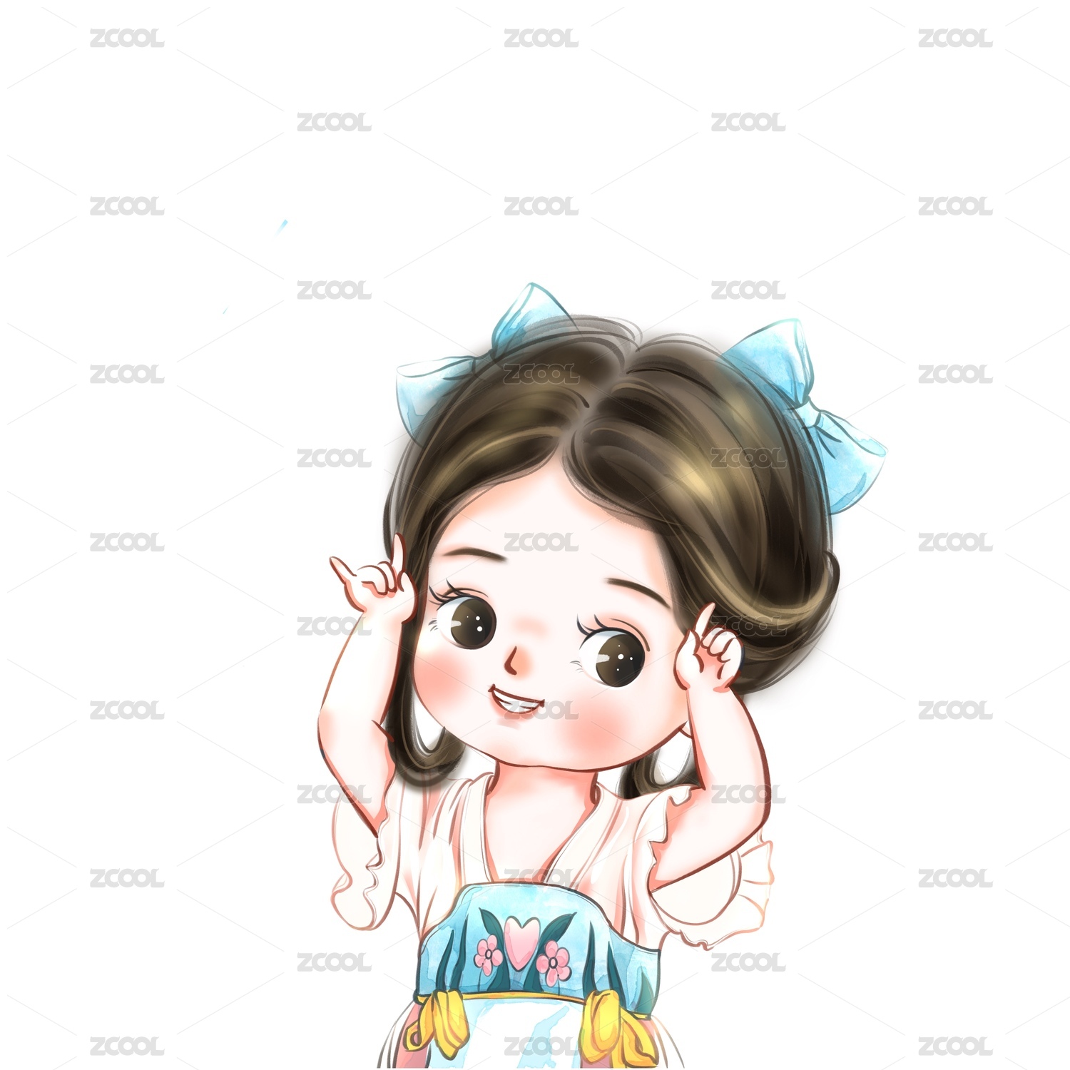 穿着蓝色连衣裙戴着粉色蝴蝶结的卡通女孩高