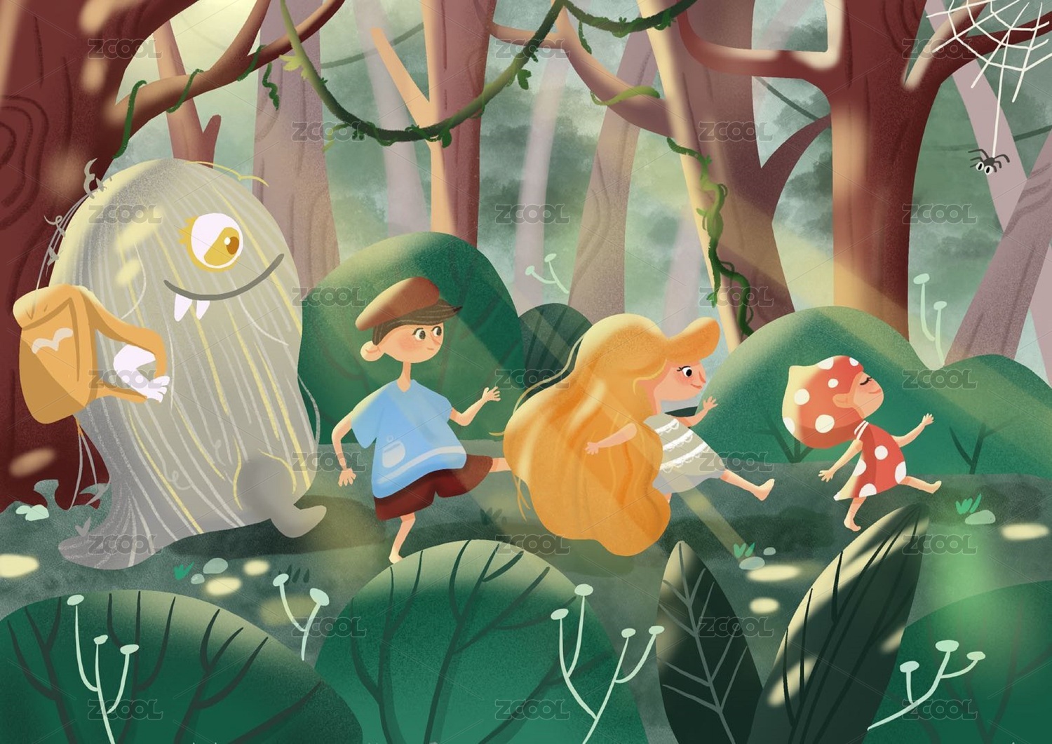 孩子们和小怪物在丛林探险