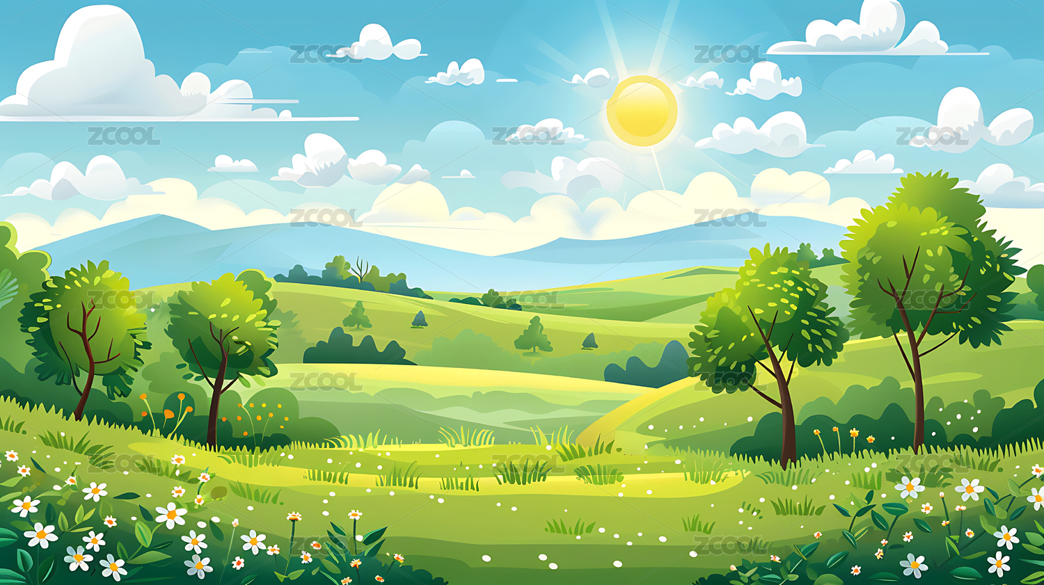 3D卡通春天蓝天草地花朵树木山丘插画
