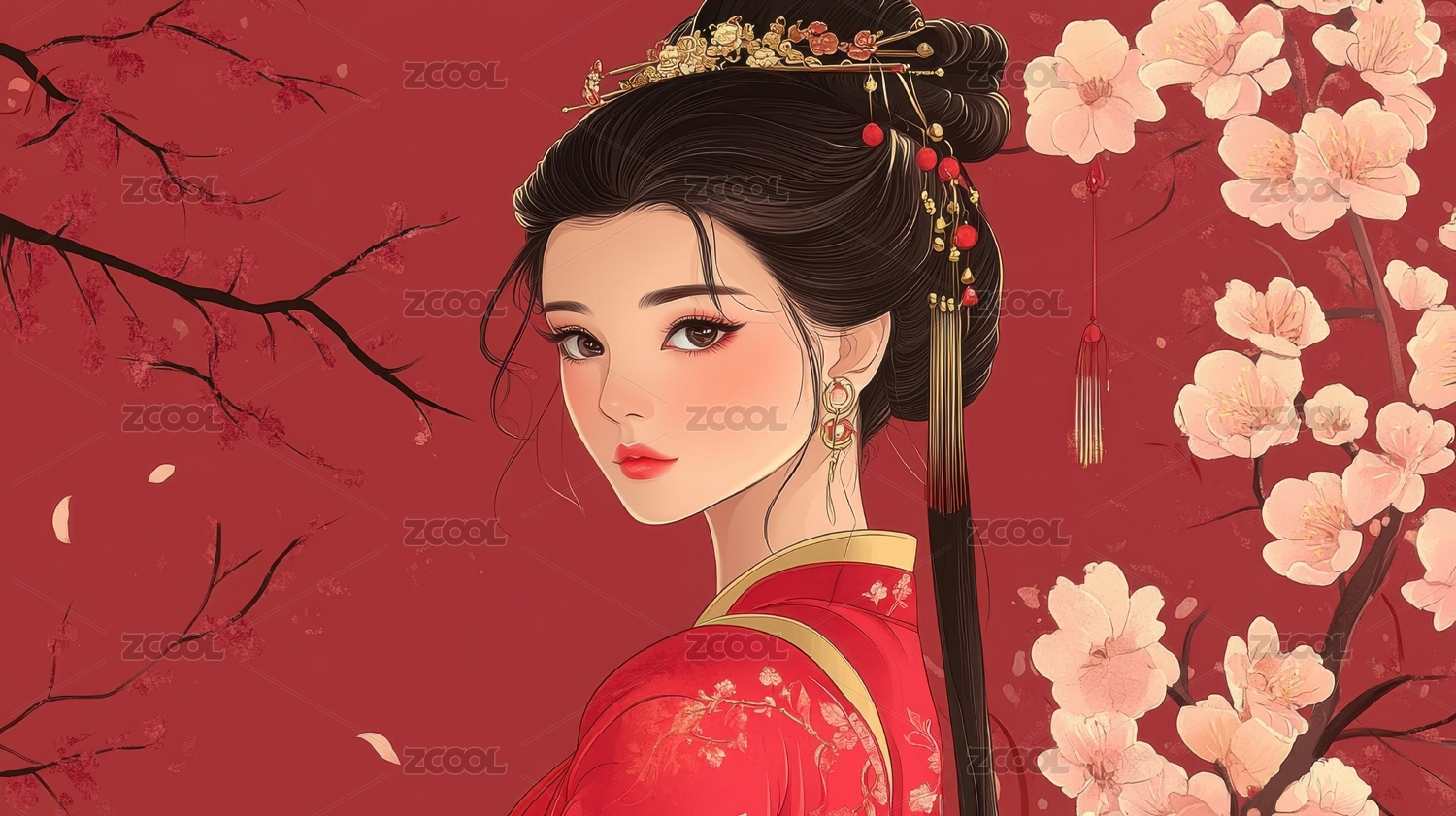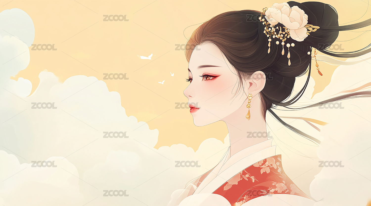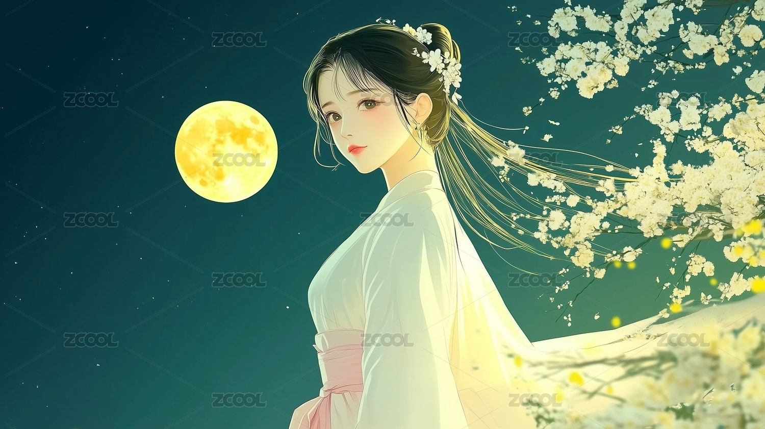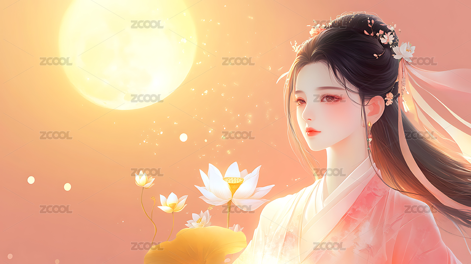 飞天,嫦娥,清新,插画,女生,月亮,花,发髻,满月