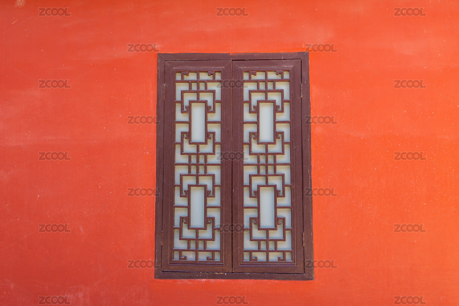 中式传统古建筑灰砖红色墙上的拱形镂空石窗