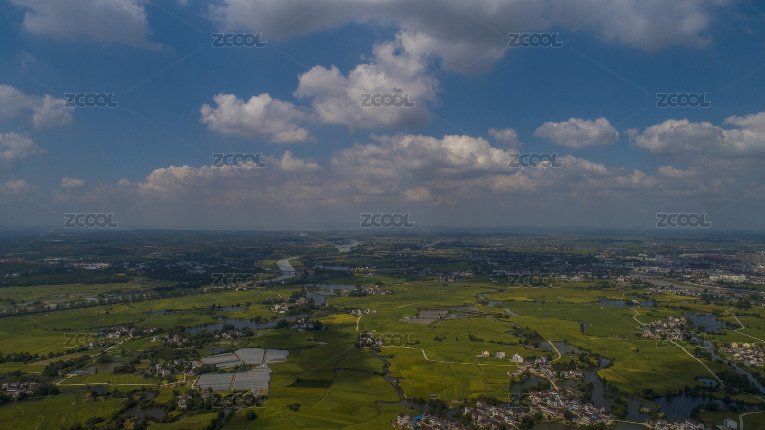 航拍蓝天白云下田野河流及县城