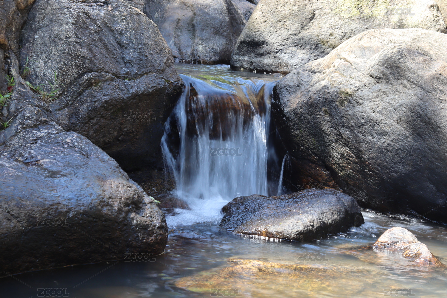 小瀑布与石头场景特写