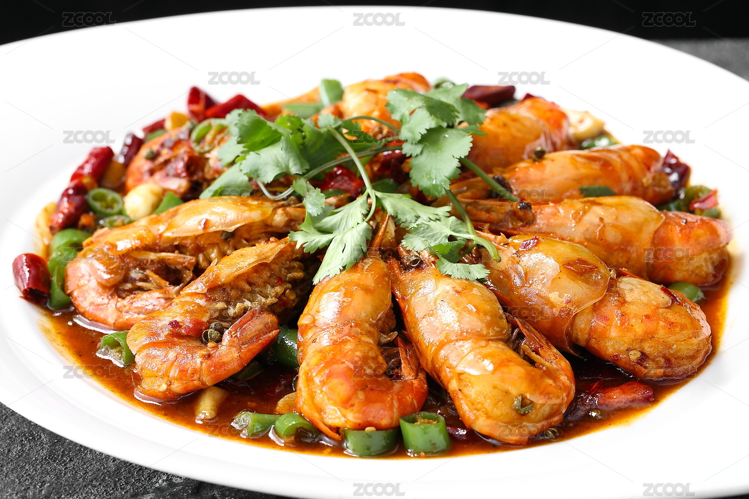 白方盘里的油煎麻辣大虾