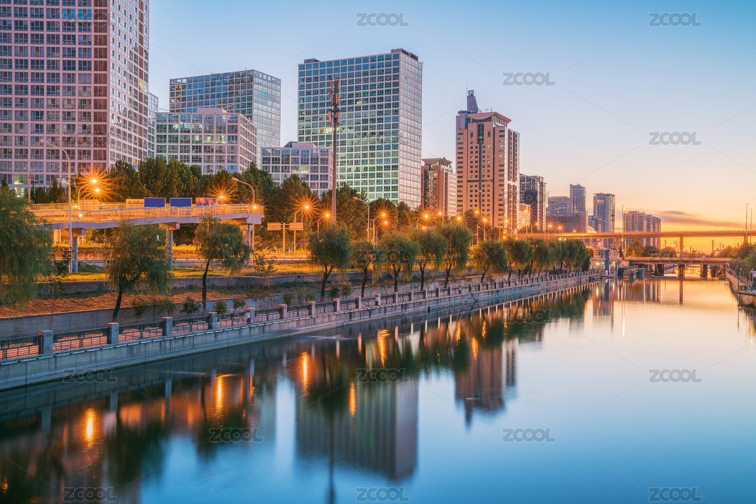 北京建外CBD的现代城市建筑和通惠河风光