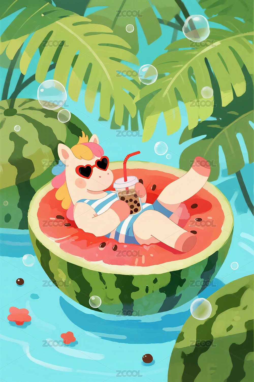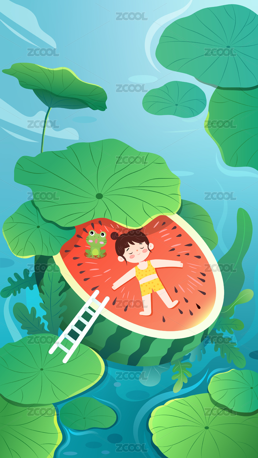 男孩,泳池,西瓜,荷叶,小暑,节气,24节气,海报,插画,插图