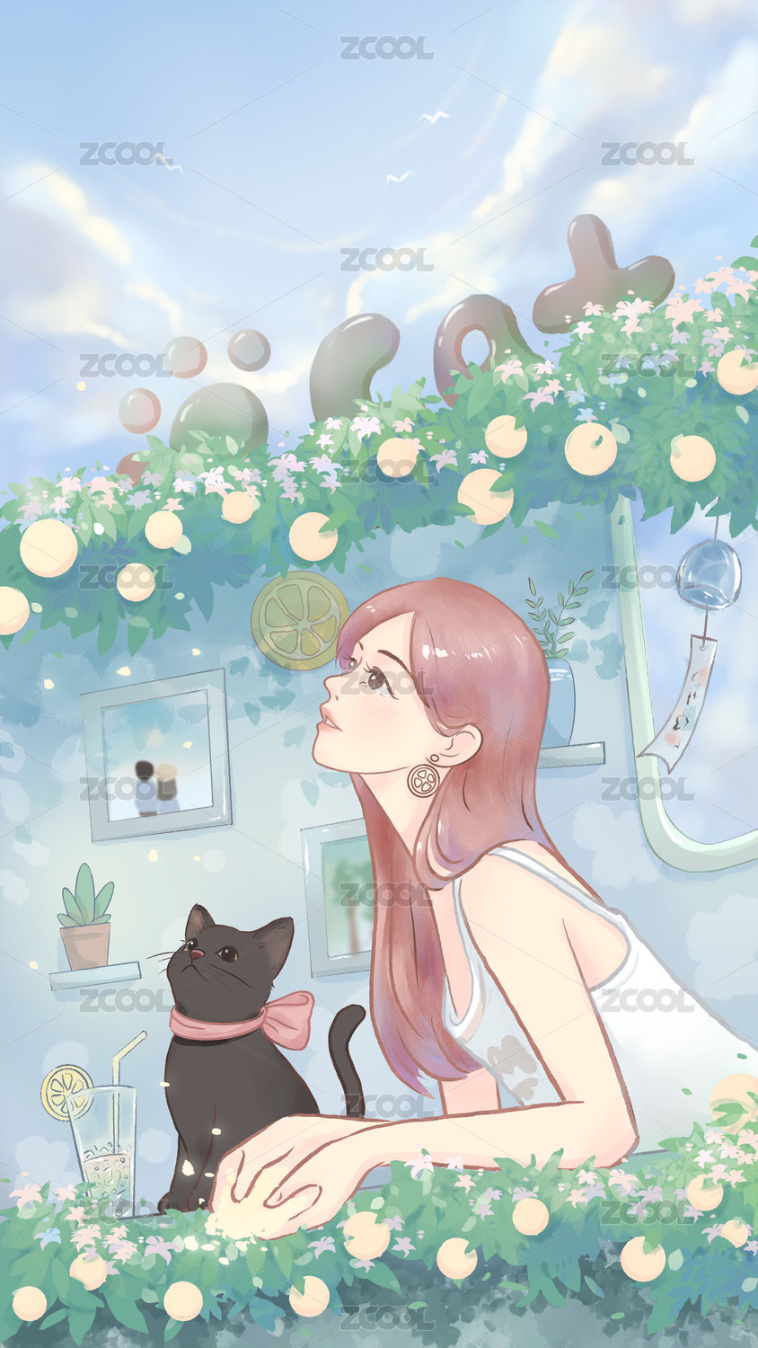 山野中一个女孩抱着猫远处一只狗在追飞盘