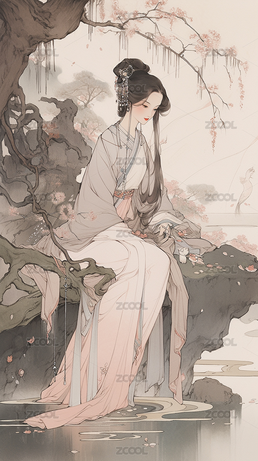 古风女人,国风,水彩,水墨,长发古风,女人,古代女人,长裙,插画