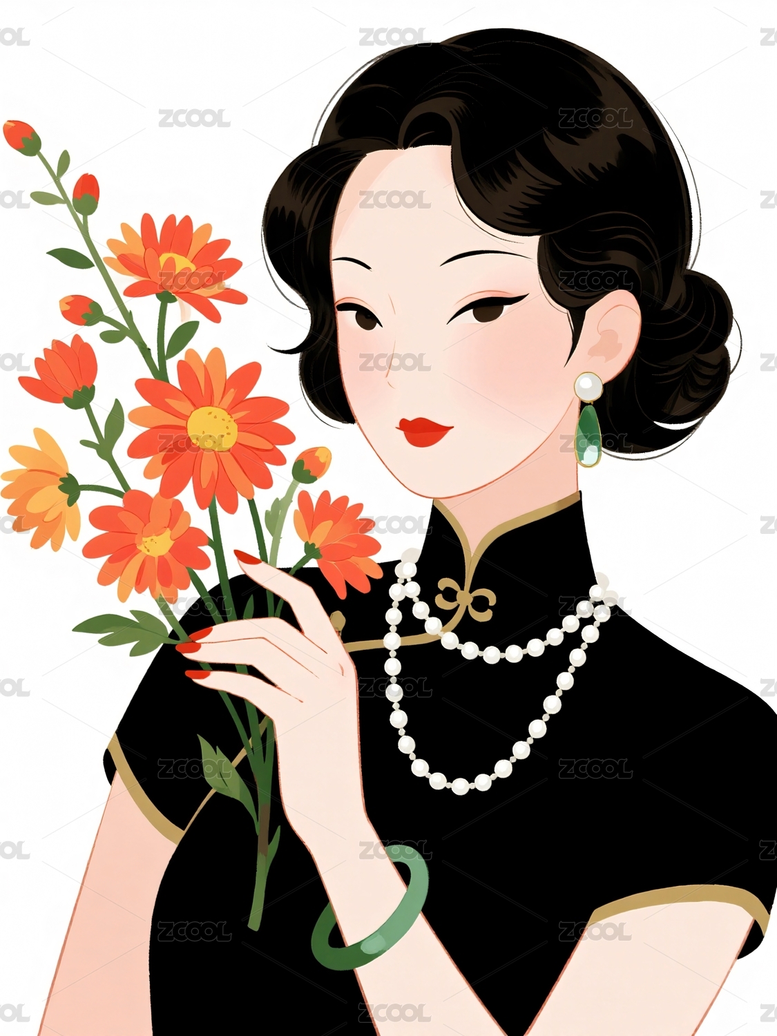 女子持花绿色旗袍珍珠项链