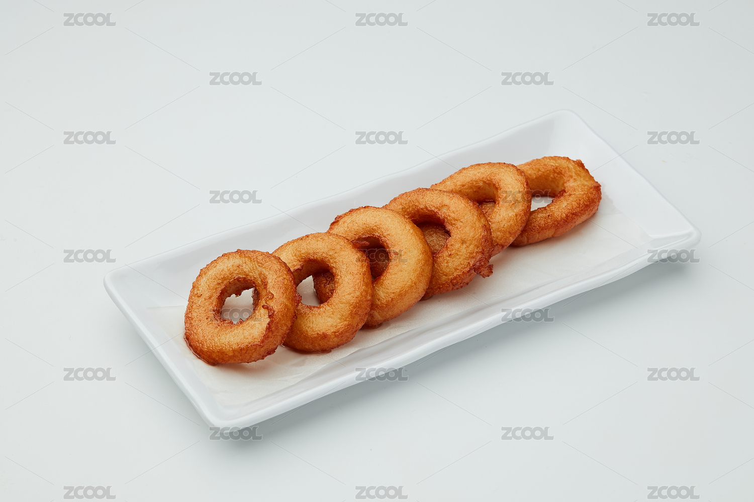 长方形瓷盘装的香炸小油饼摆放在樟木砧板上