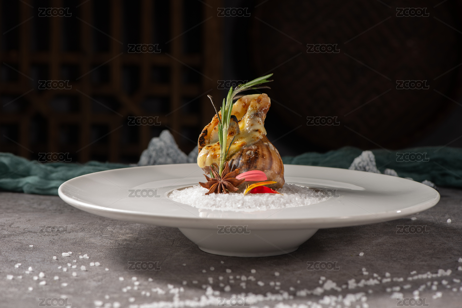 白色瓷盘装的藤椒鸡汁小鲍鱼