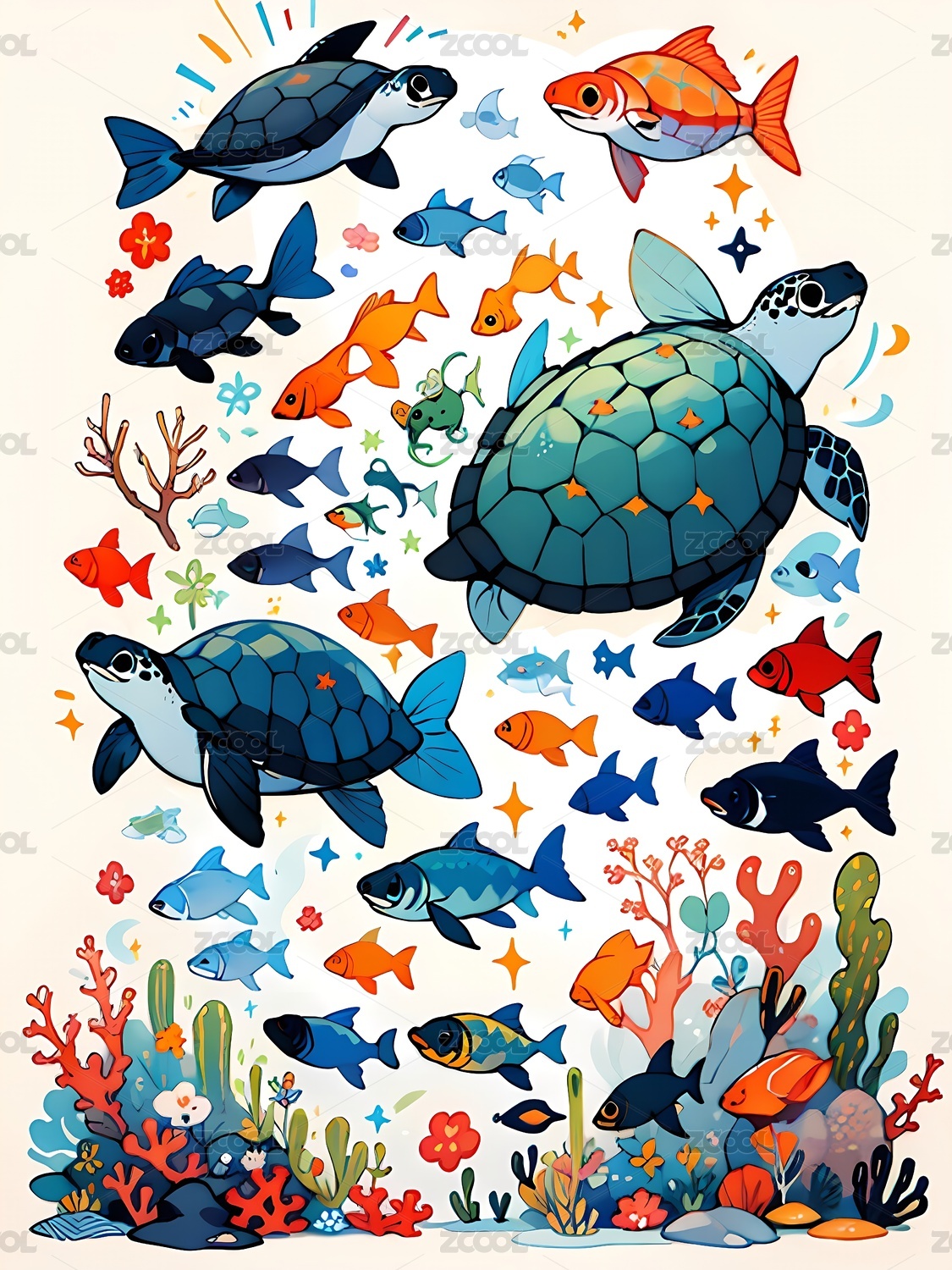 大量鱼群与海龟漫画风