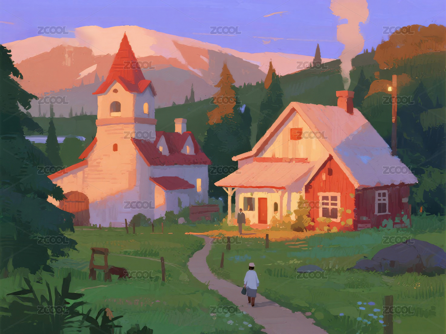 山间小屋与教堂的宁静黄昏