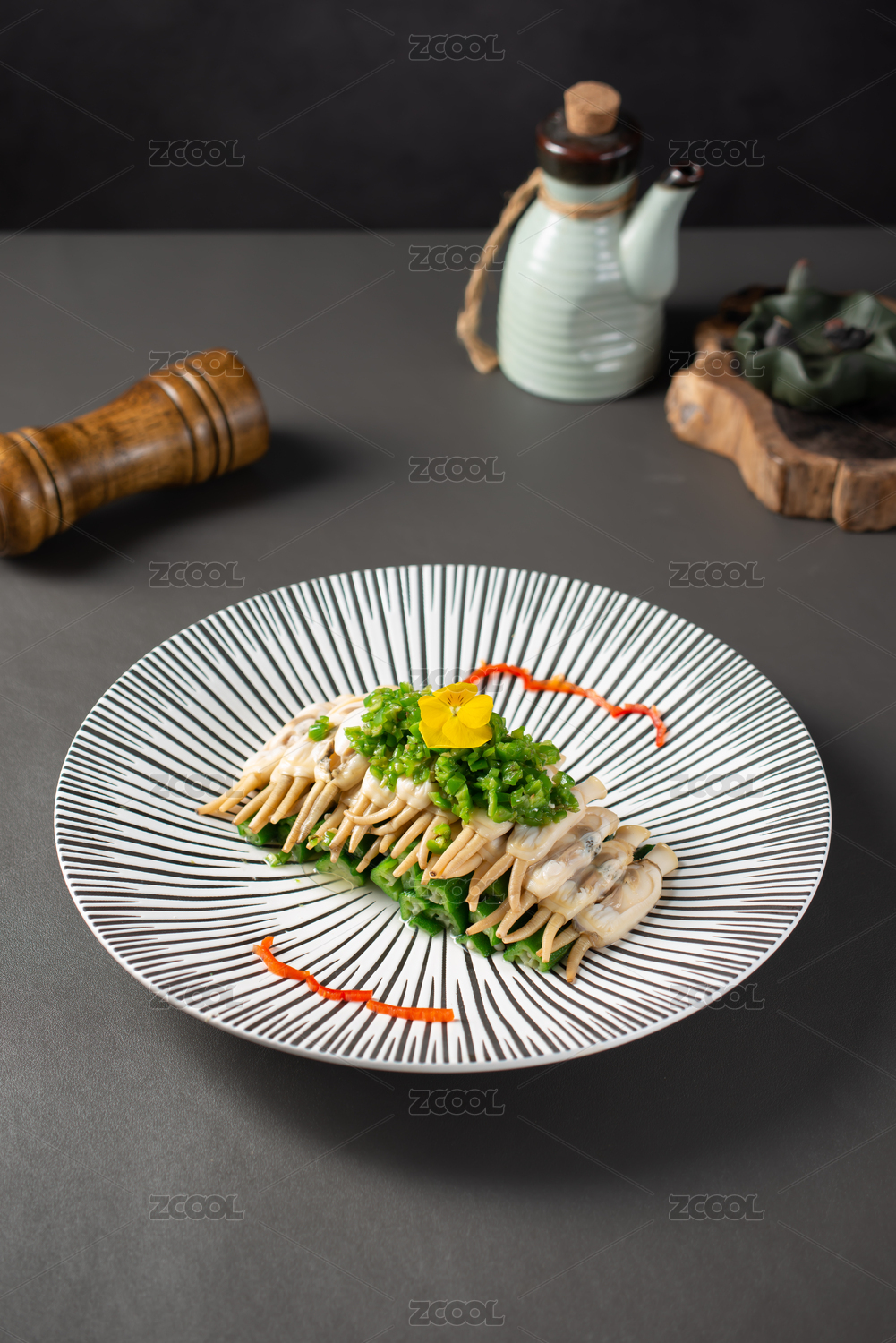 白色圆盘装的虾胶马蹄饼摆放在黑色鹅卵石上