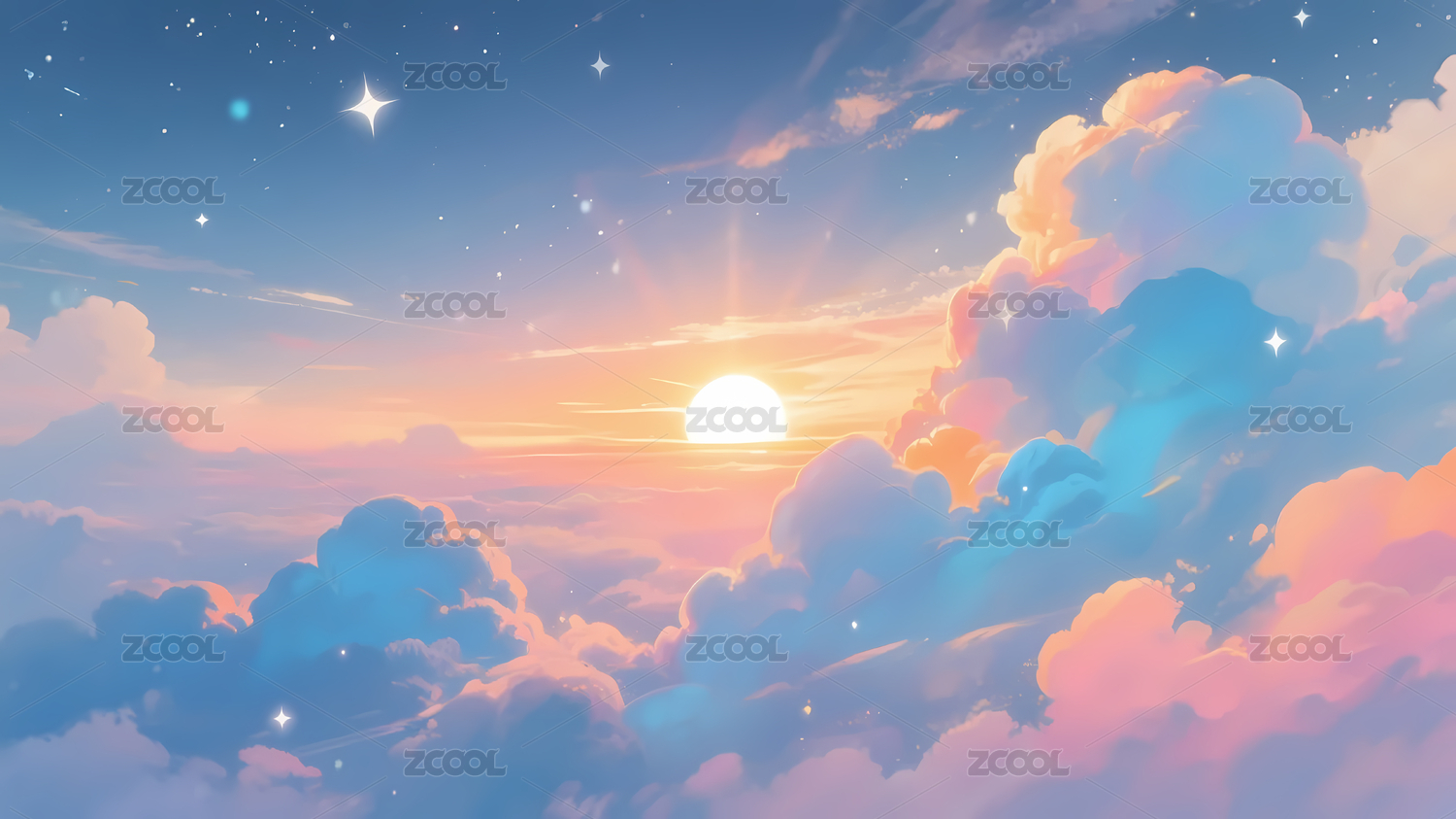 梦幻治愈云层插画,夏天唯美天空云彩风景插