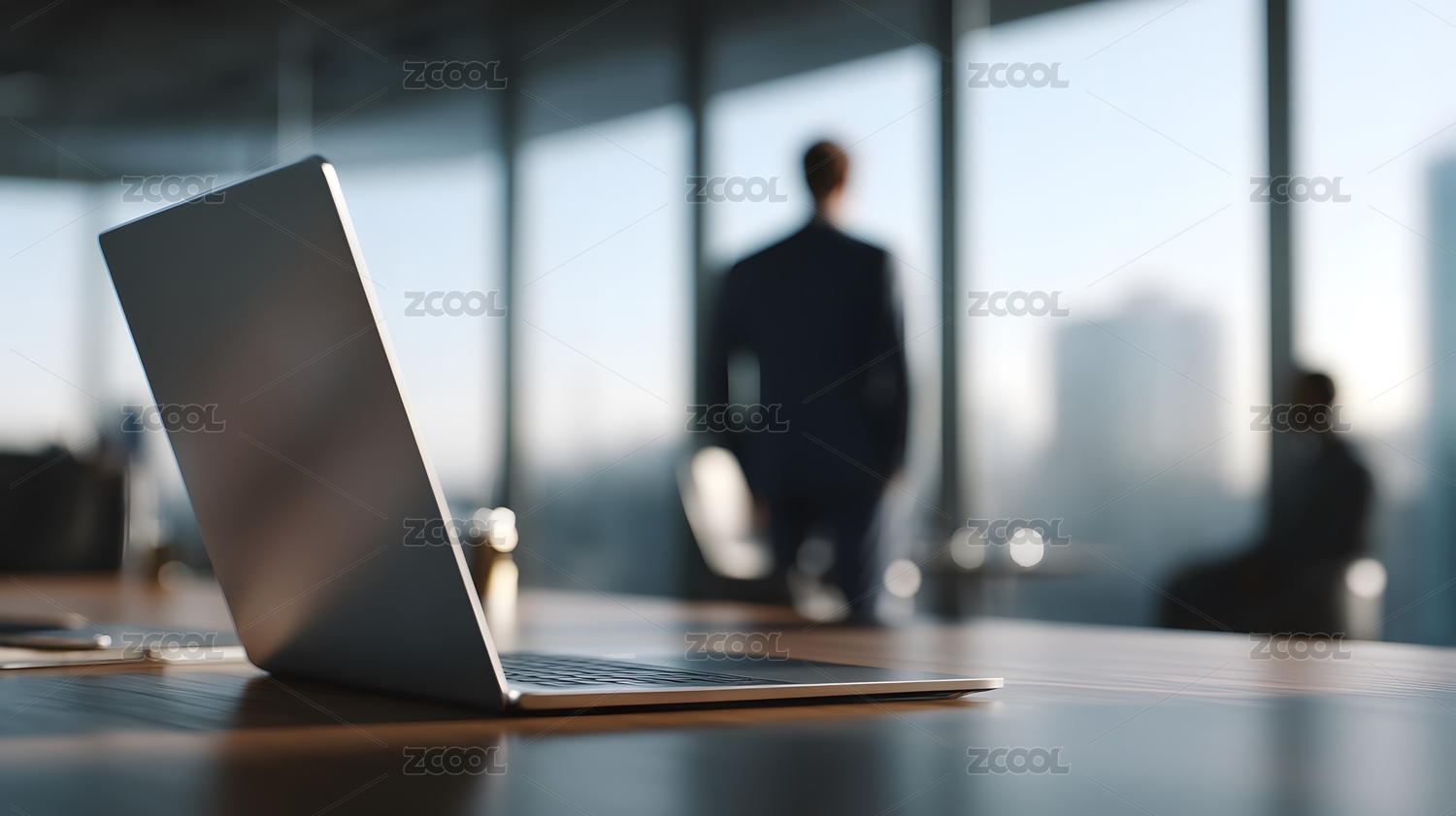 办公桌上的笔记本电脑与背景中的人物