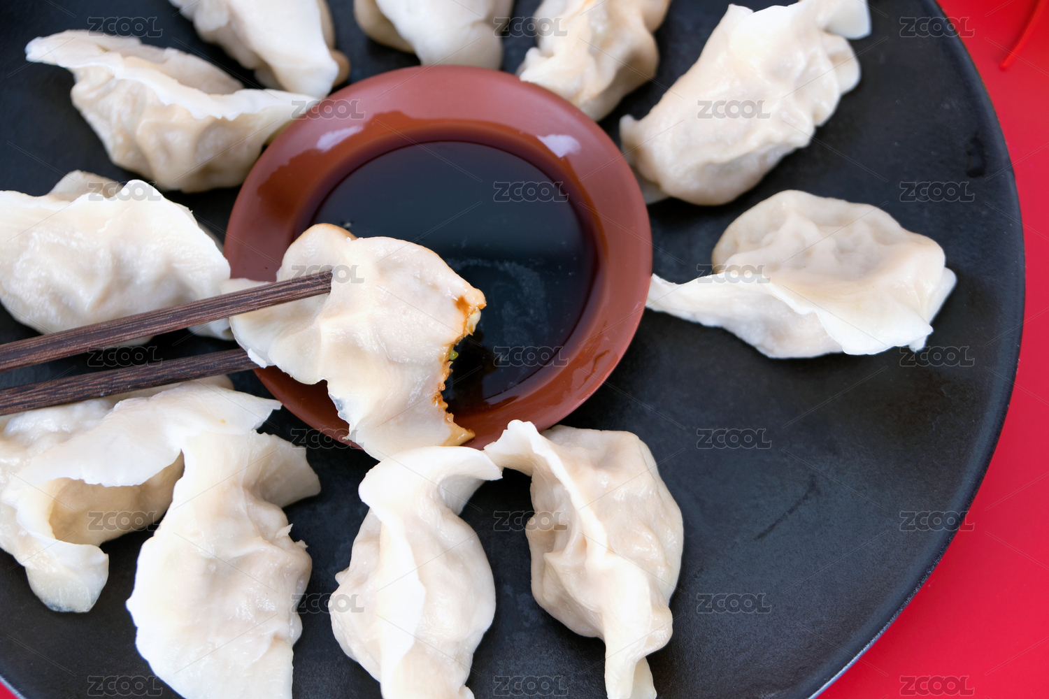 筷子夹起盘子里的饺子蘸进醋和辣椒调制的蘸料中