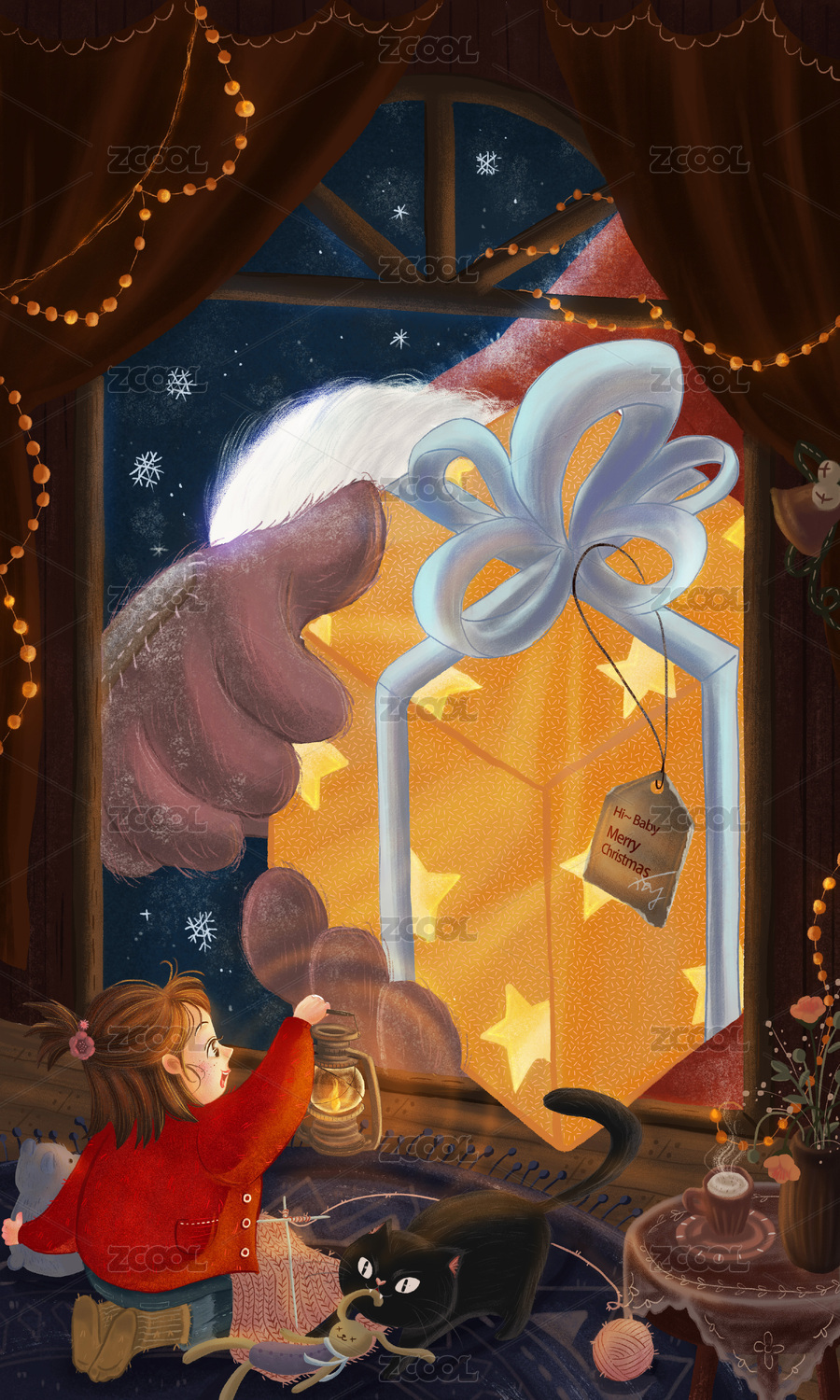 圣诞节圣诞老人和女孩猫咪庆祝节日氛围