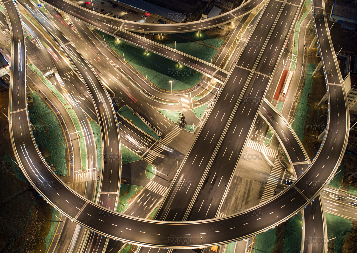 夜间汽车行驶的多层高速公路交叉口顶视图