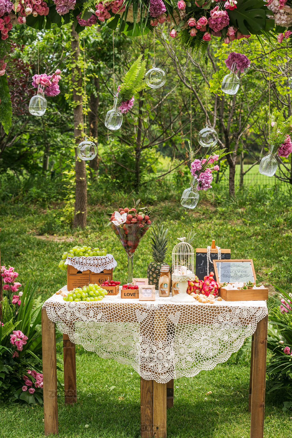 户外草坪的桌子上放着花瓶和蓝色系甜品。