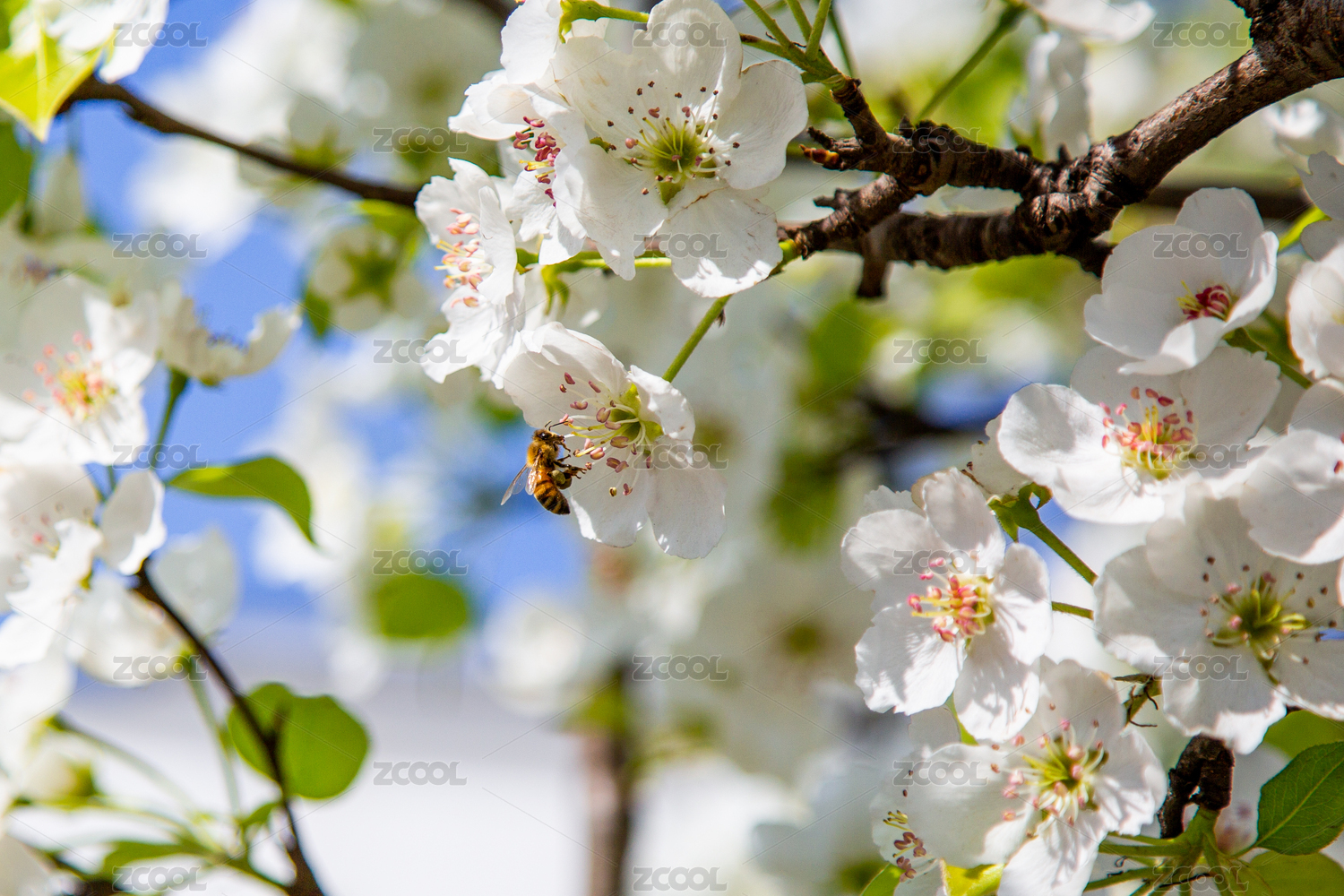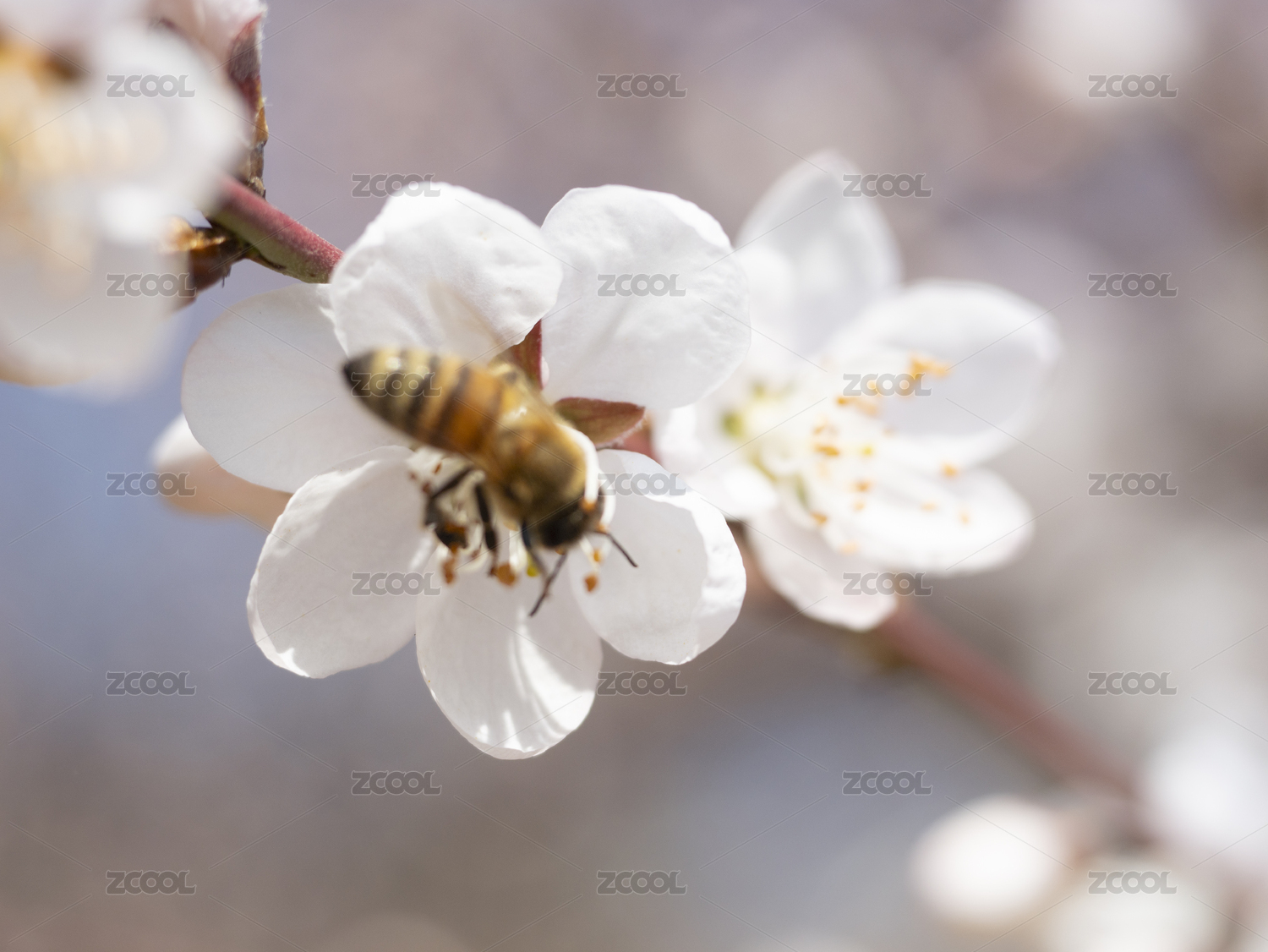 春天蜜蜂在梨花的花瓣上采蜜,微距特写