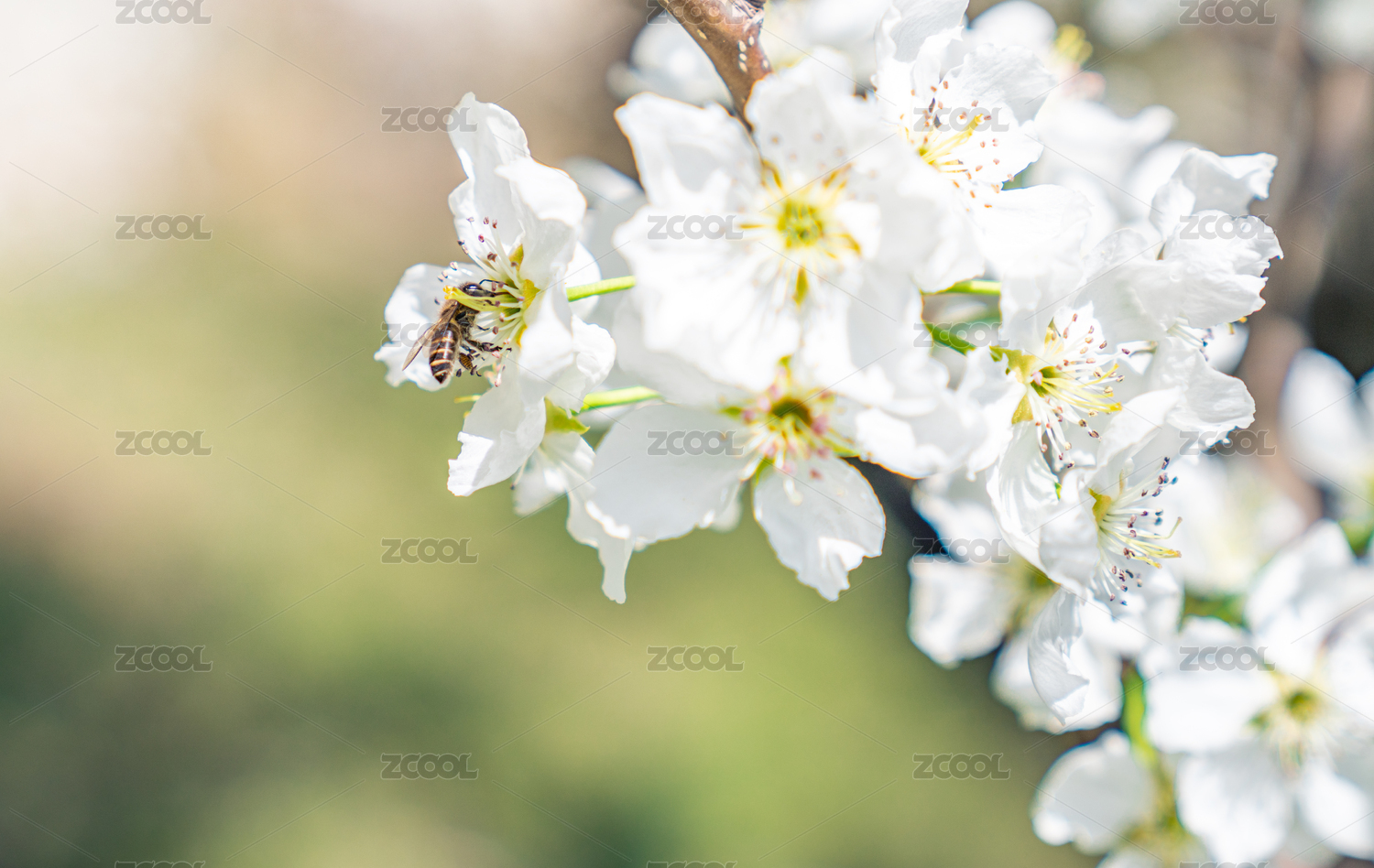 蓝天下阳光中盛开的白色樱花与蜜蜂