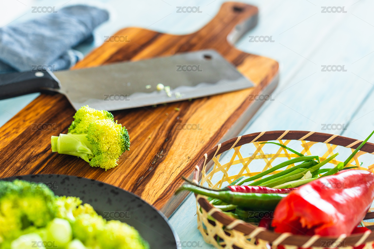 砧板旁边的碗里放着刚切好的西兰花