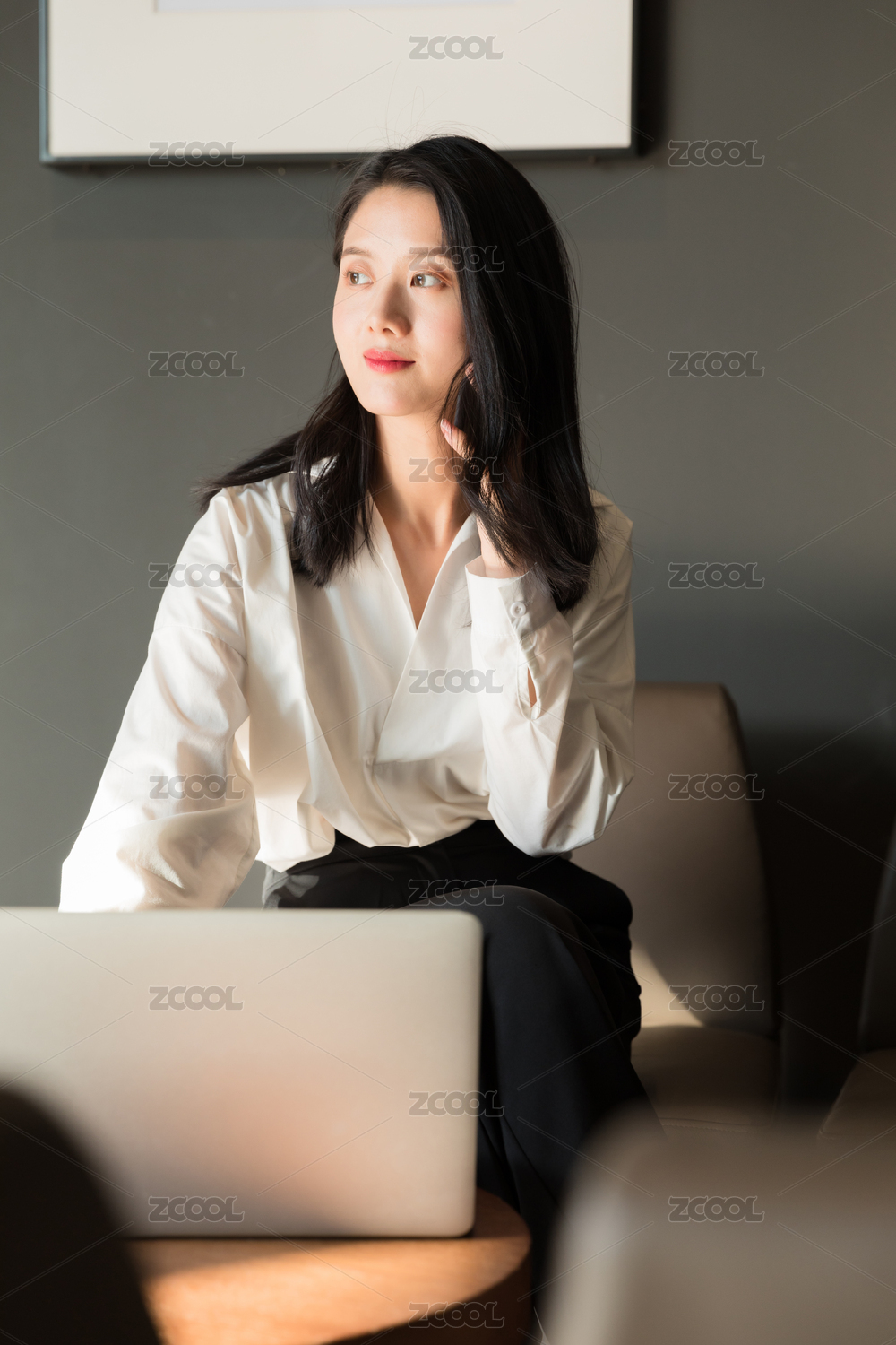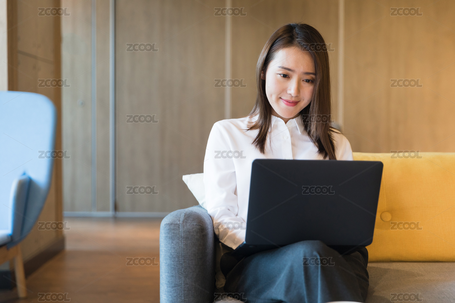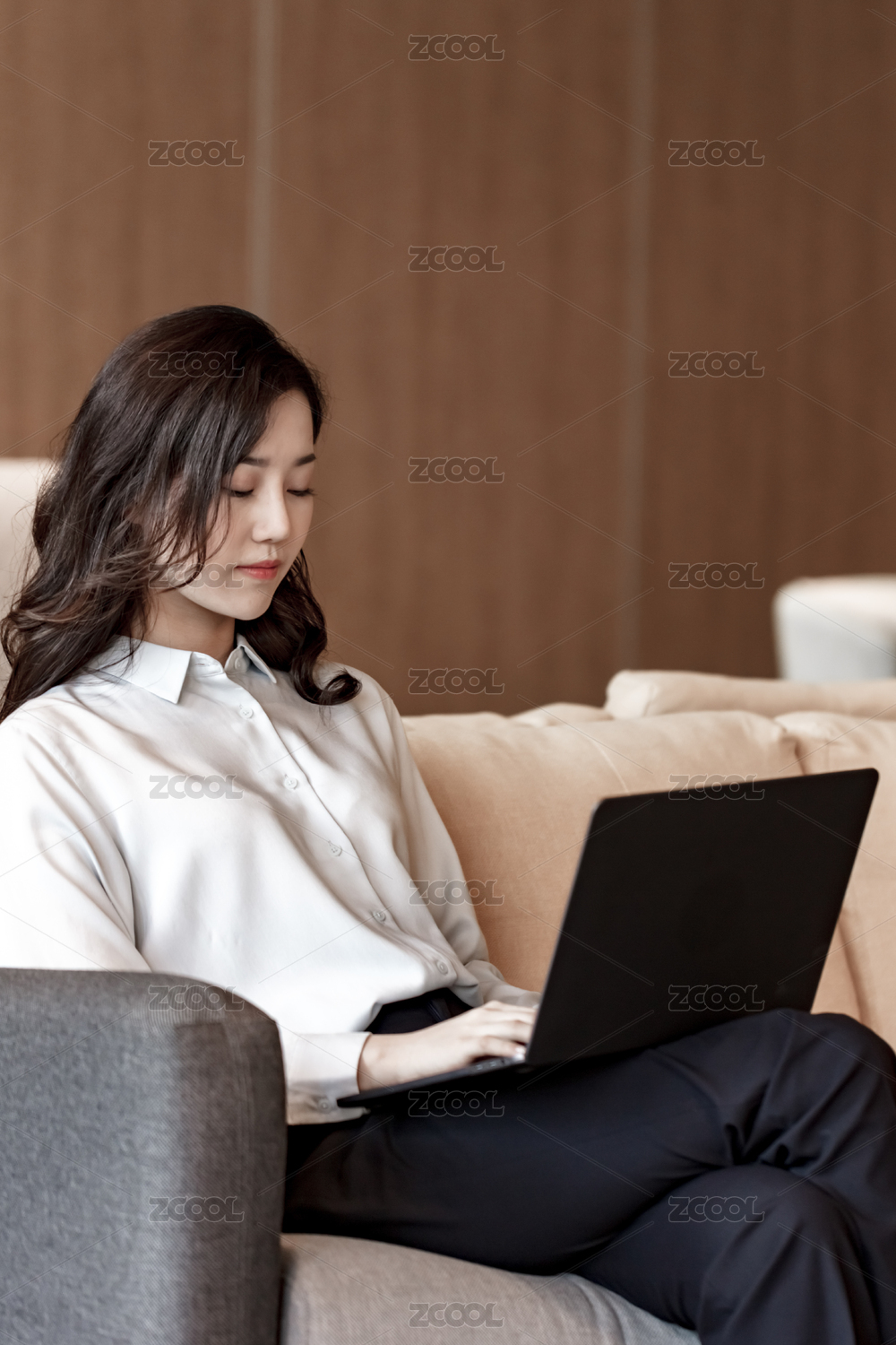 坐在沙发上使用笔记本电脑工作的职业女性形象