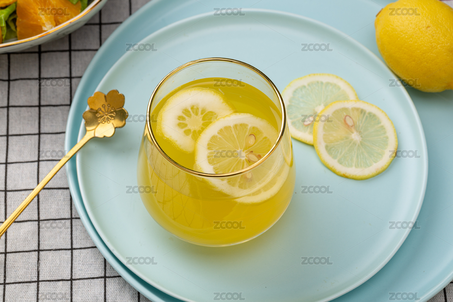 桌面上的木砧板上的玻璃杯子里的柠檬红茶