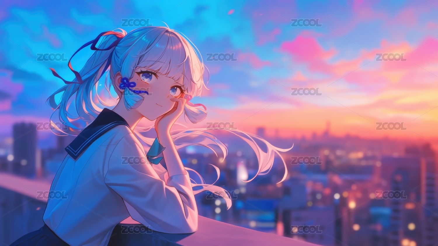 白发少女眺望城市夕阳