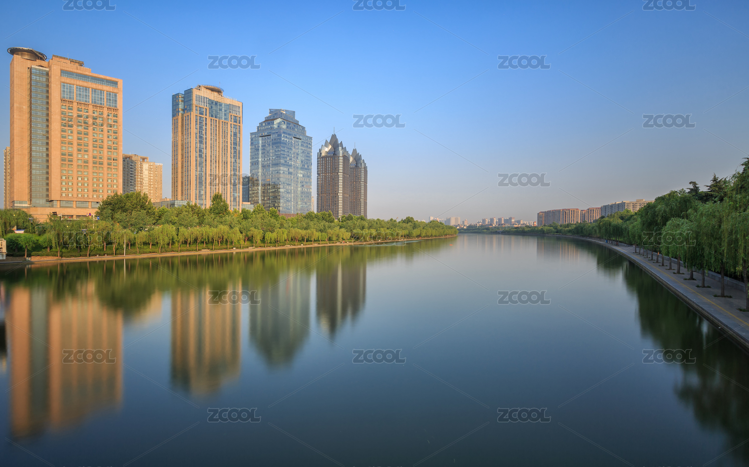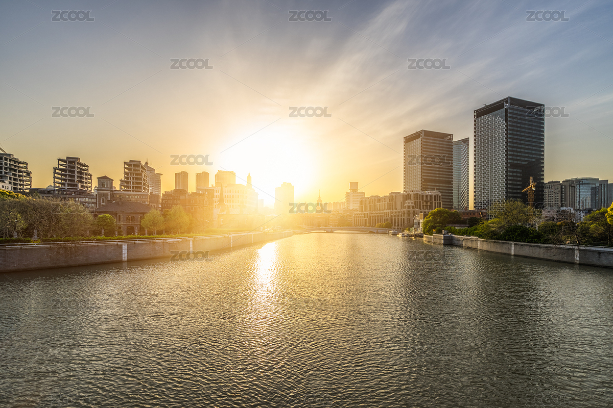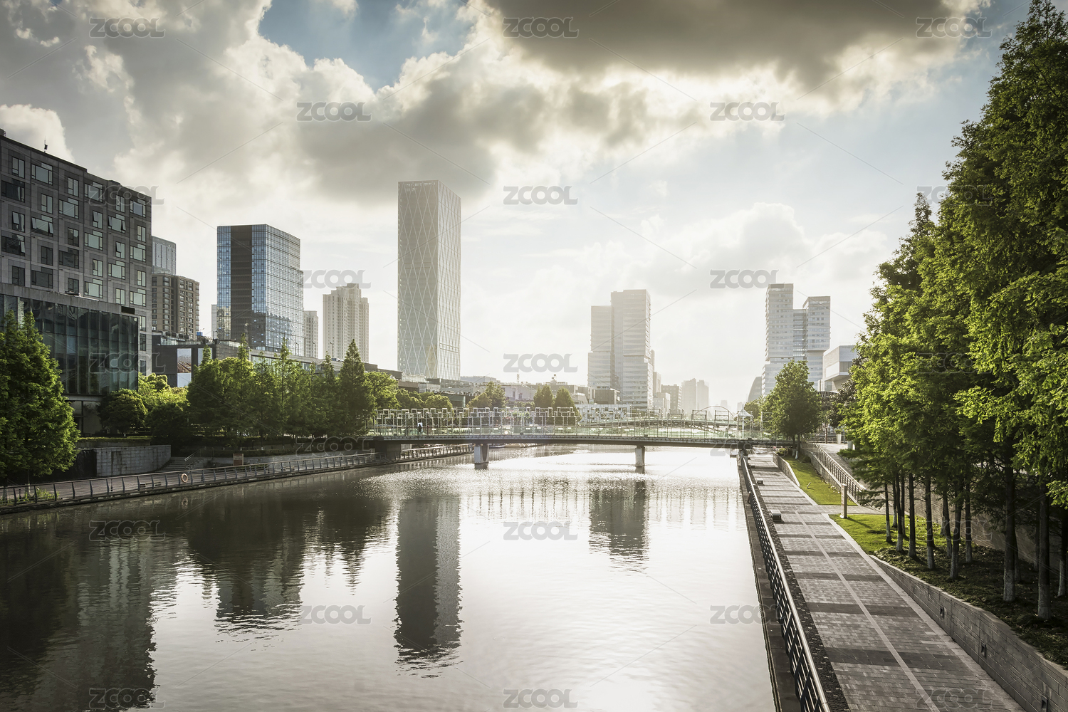 中国天津海河的水路交通和现代建筑及桥梁天际线
