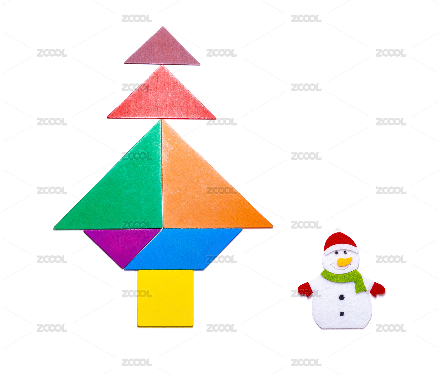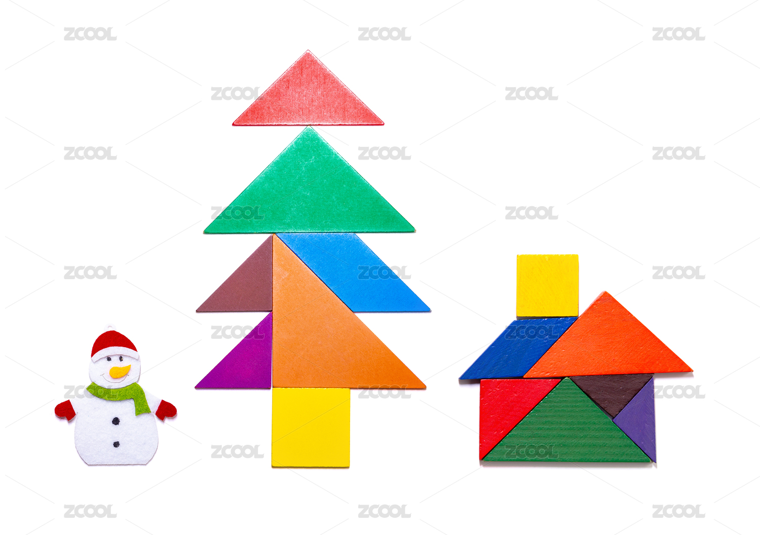 七巧板拼成的圣诞树及房子和雪人麋鹿