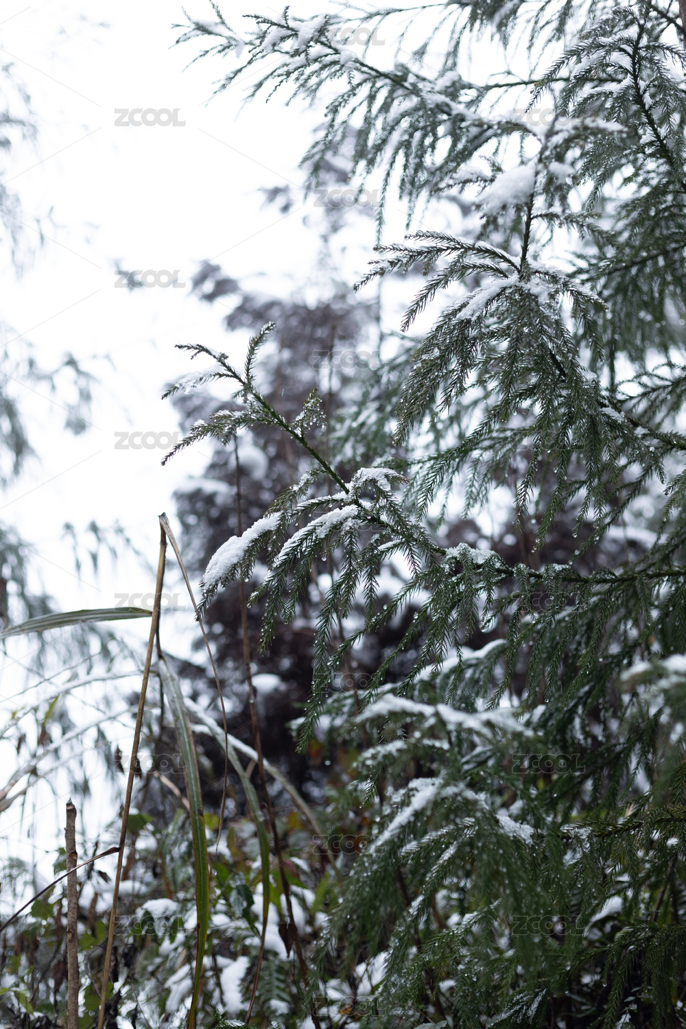 大雪后被冻住的植物杉木
