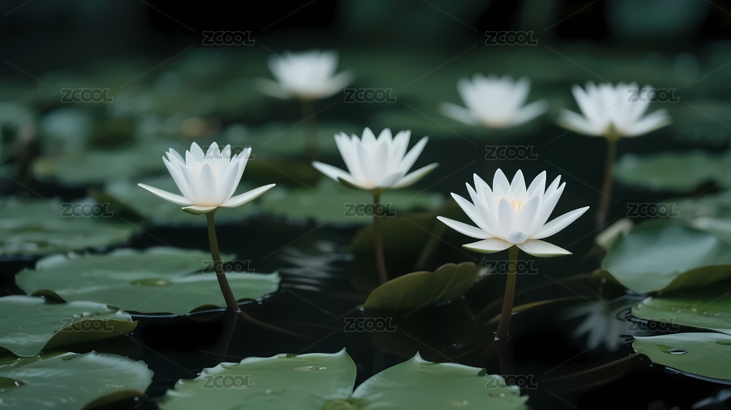 池塘,白,睡莲,花瓣,花朵,植物,绿叶,白天,盛开,花蕊